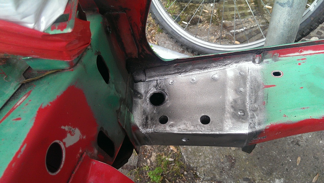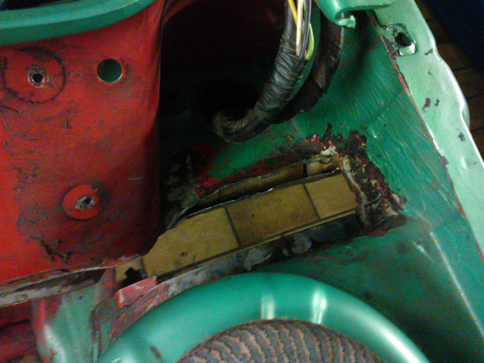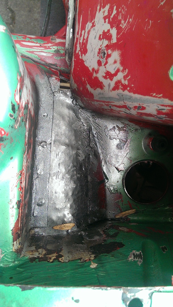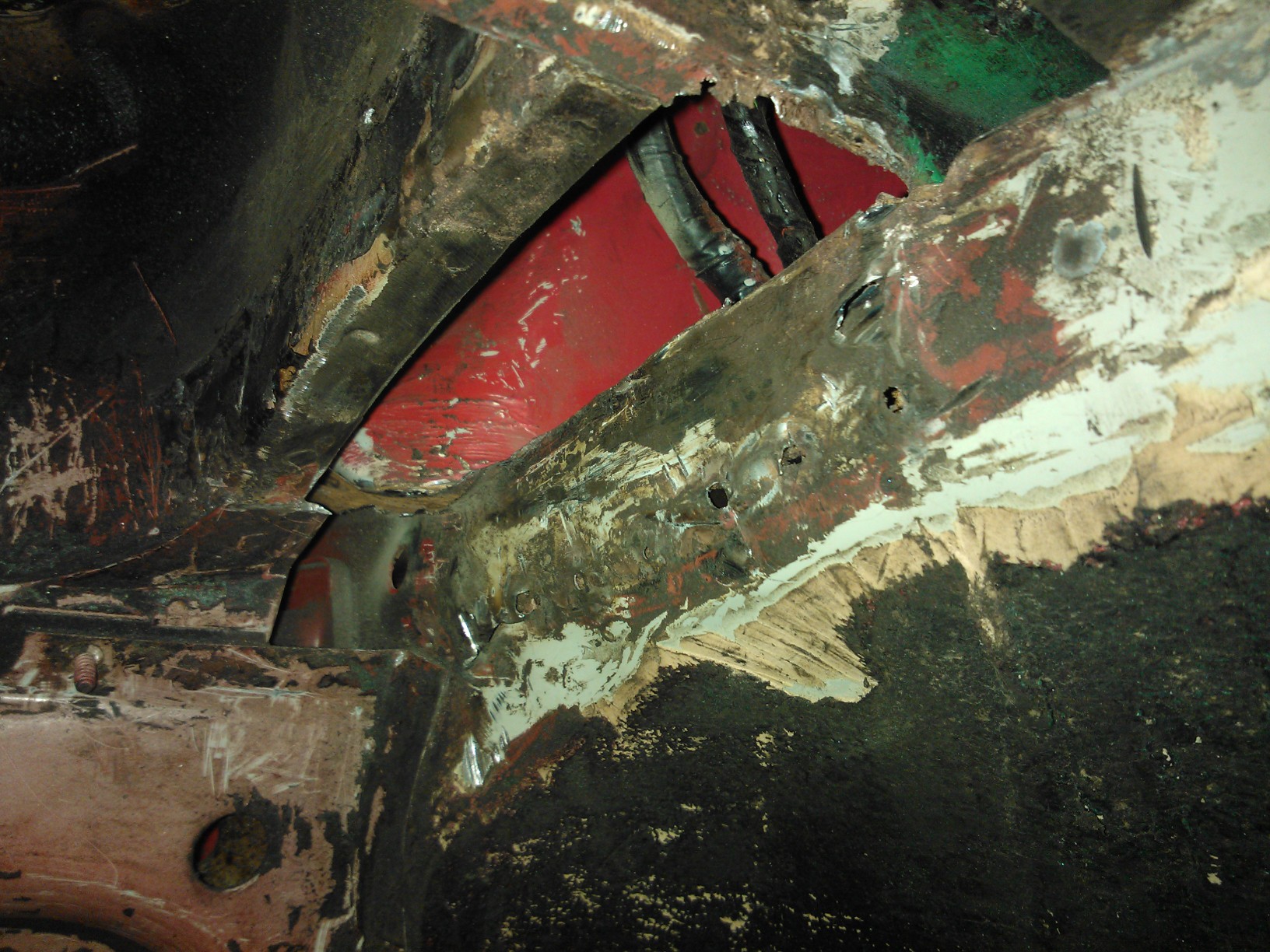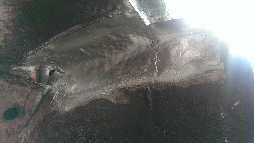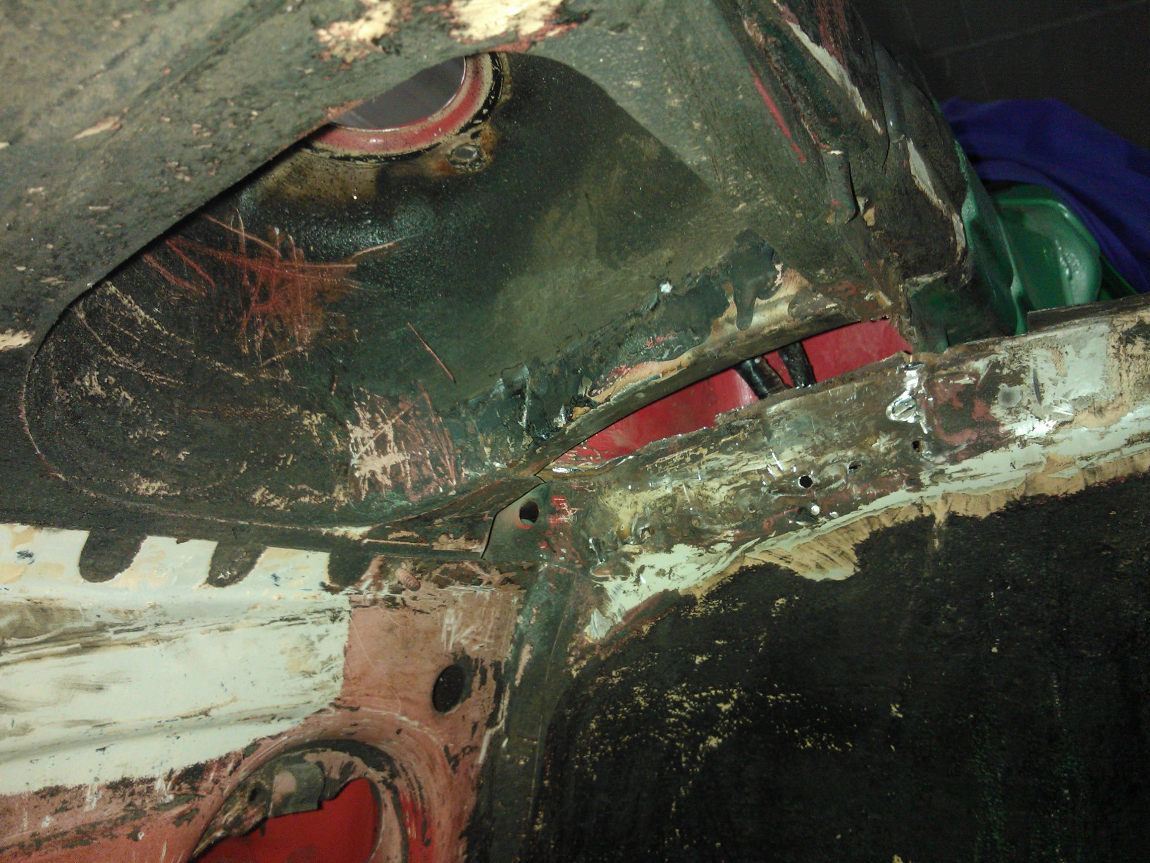 Mit Flex und Dremel kam es zu schweren Ausschrietungen deren Ergebniss es jetzt zu sehen gibt. Die Blechflicken sind soweit entfernt und das gammelige Orginalblech auch. Zumindest ist jetzt eine kleine Basis geschaffen um weitere Massnahmen zu treffen. Paralell dazu ging es mit Nitro und Aceton dran die Spritzwand von den Kleberesten der Dämmatte zu befreien. Dbilas ist ja ein netter Laden aber mit kundenorientiertem handeln haben sie nicht soviel am Hut. da ich den Kopf nicht brauche momentan ist das aber auch halb so schlimm.