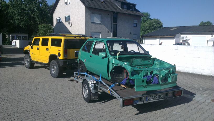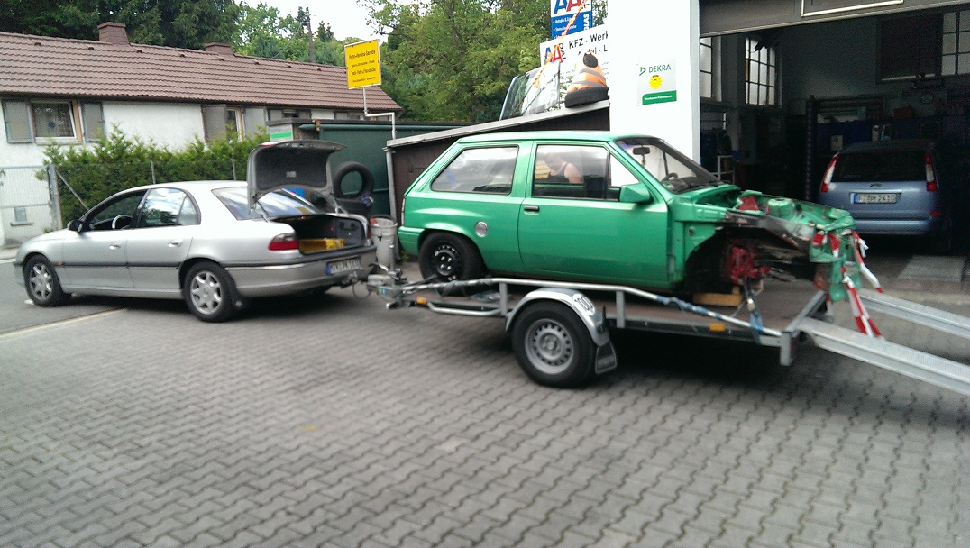 Damit es nicht wieder ewig dauert bis es voran geht ging es dann auch gleich weiter zum lackieren. Ein Glück ist der Corsa nicht so groß und hat auf einen Motorradanhänger gepasst.