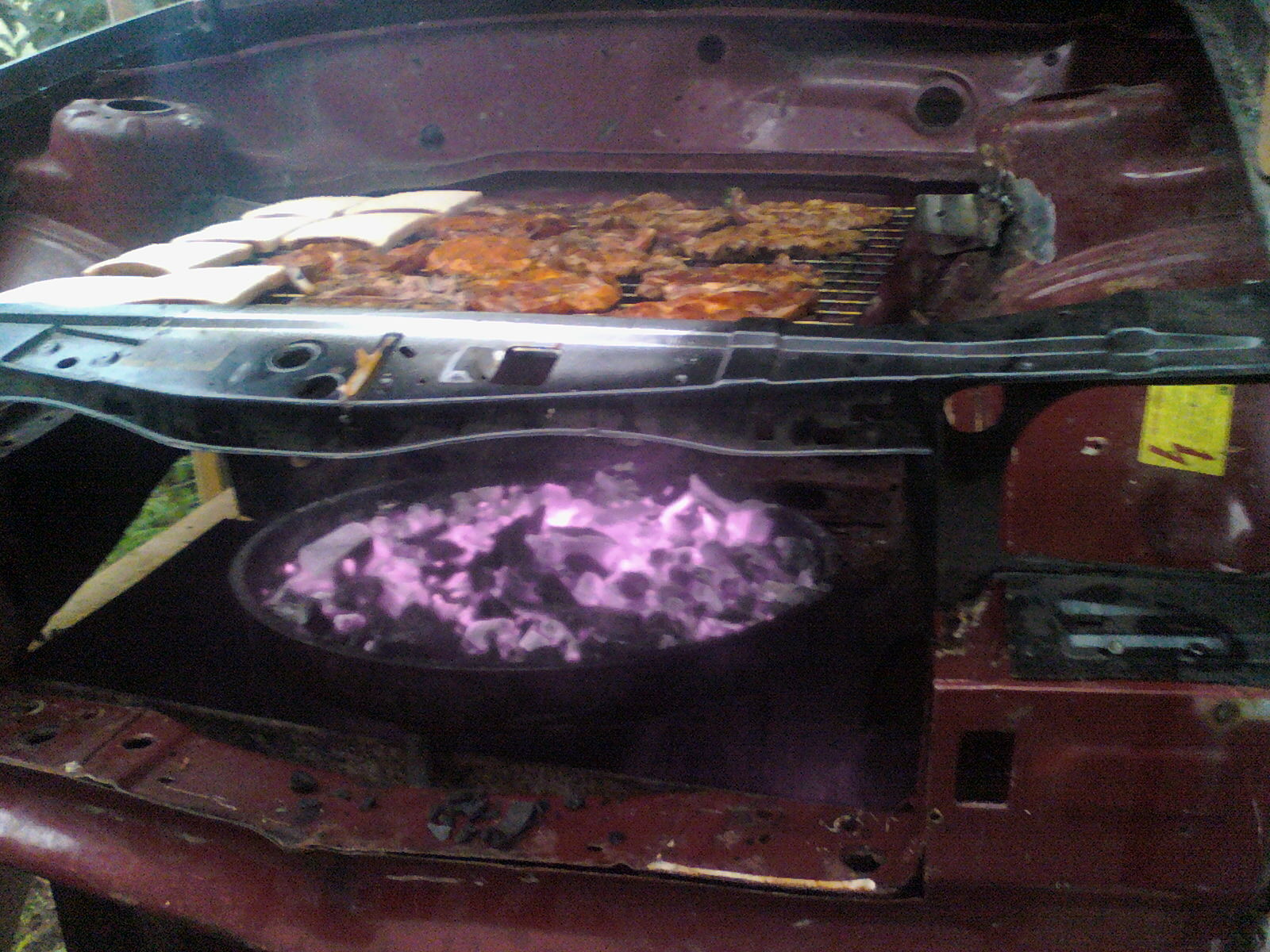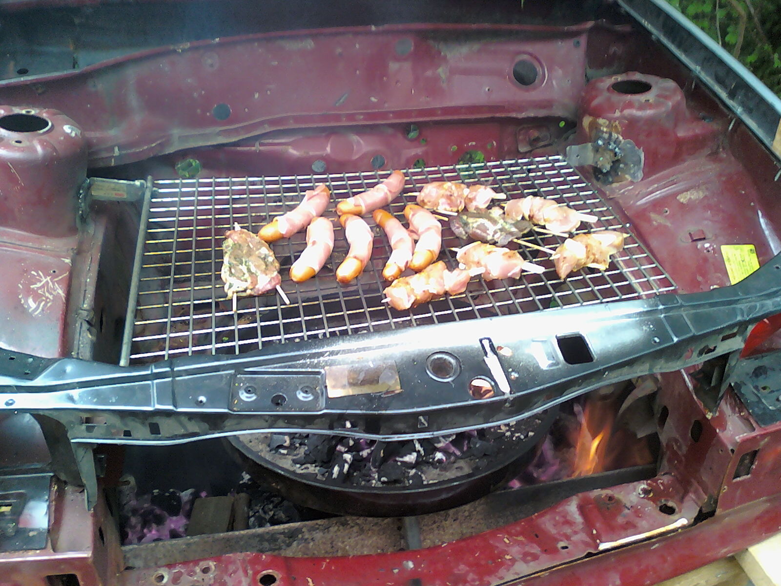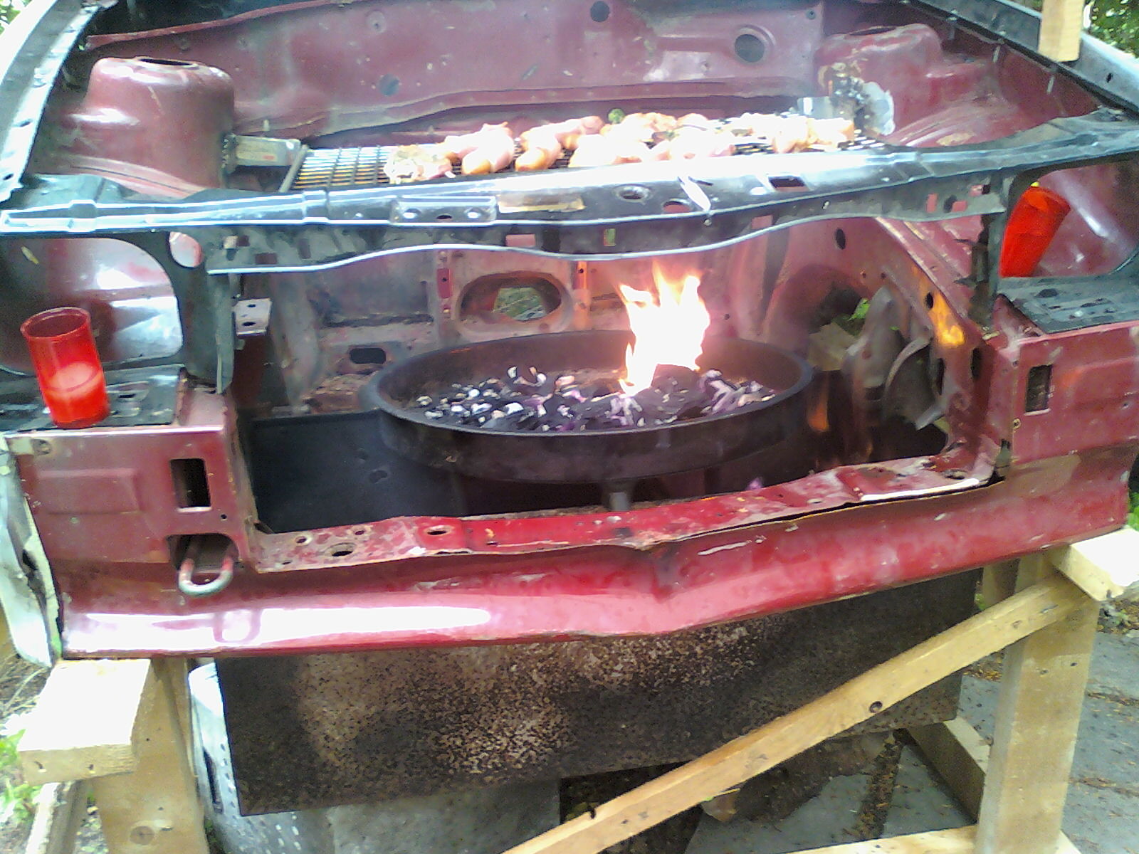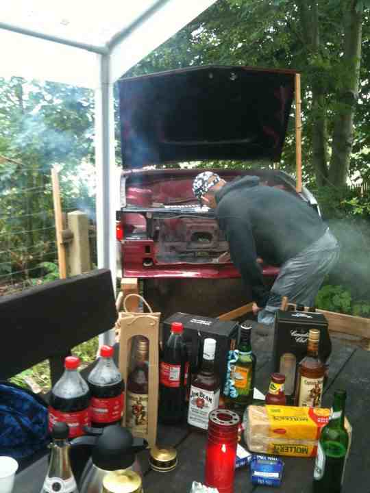 Haa,gefunden.Wie schon auf Seite 3 zu sehen war hatte ich ja meinen Armee-Corsa zerschnitten und zur Bar und zum Grill umgebaut.Hab jetzt wieder ein paar Bildchen gefunden als wir den Grill zum ersten mal benutzten.