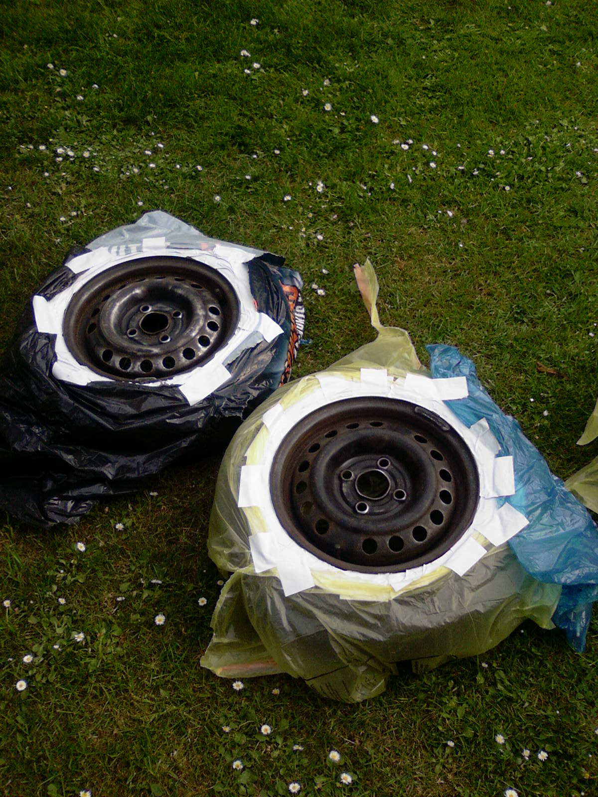 das ganze werde ich vieleicht nochmal mit schönen 15zoll stahlfelgen machen. Sandstrahlen, Pulvern in Schwarz und dan den weißen Ring lacken. Dann Ventiele rein und dann die Schlappen drauf so wie es sich gehört.