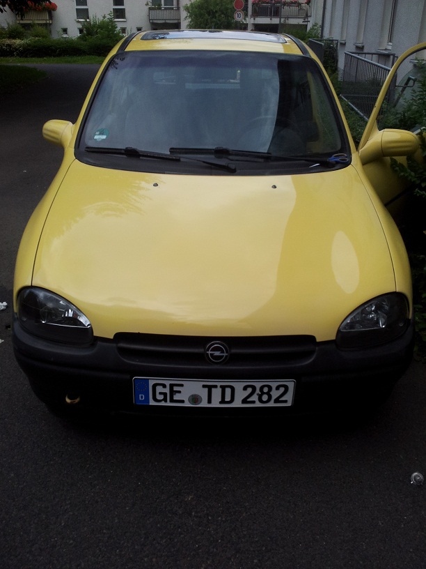 Ich bin immer fröhlich und warte noch auf meine Vollendung (lackierte Stoßstangen, Heckspoiler, schwarze 3 Speichenfelgen, Lederausstattung)