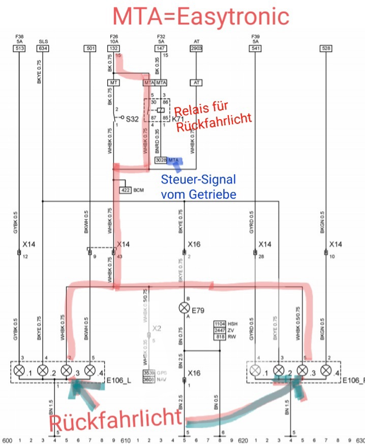 Das Steuersignal für das Rückfahrlicht-Relais müsste im Detail auch von der Getriebe-Stellmotoreinheit über deren Steckverbinder kommen.
