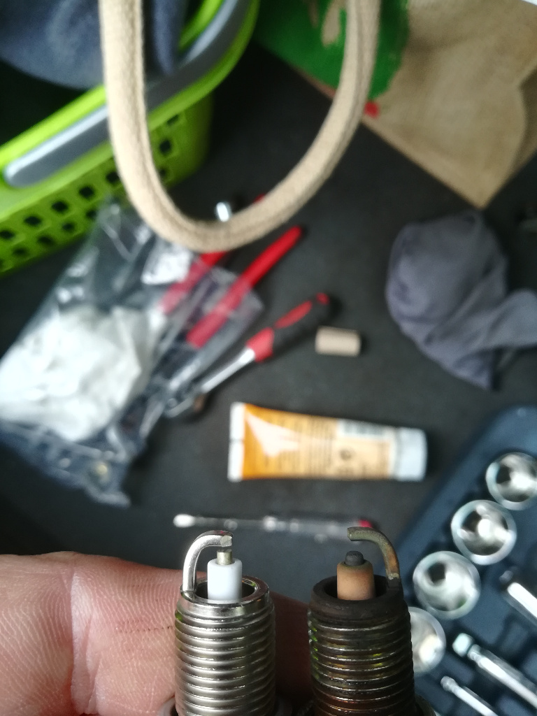 Seid Montag springt er nicht mehr an. Hab mal angefangen Fehlersuche zu betreiben, Fehlerspeicher ist leer, berühmte Tachostecker problem geprüft, mit ersatzschlüssel versucht zu starten, mal die zündkerzen überprüft...siehe da ganz schön fertig , siehe Bild....gleich mal neue eingebaut. Hat bis jetzt alles kein Erfolg gebracht. So jetzt hab ich die zündspule auf dem Ventildeckel gelegt und mal die 4Kerzen rein gesteckt um zu schauen ob zündfunke kommt...und es kam kein einziger Funke. Während meine Frau weiter die Zündung betätigte griff ich den Zündverteiler am Stecker an und wollte anheben ob ich was erkennen kann und da bekam ich eine gewischt und der Zündfunke war an den Kerzen zu sehen.