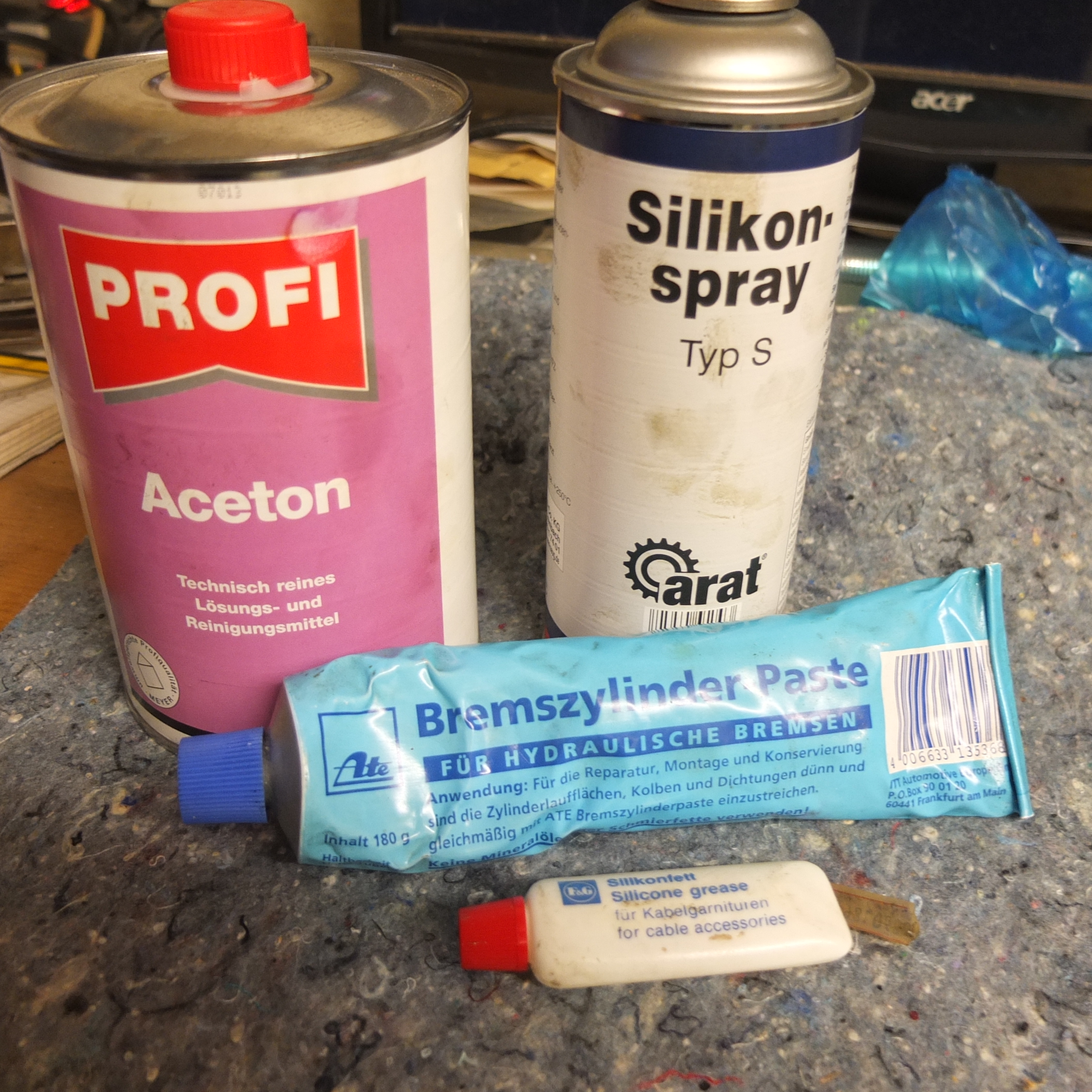 Was nehme ich dazu. Aceton zum reinigen des Bremskolbenzylinders, Silikonspray für die Führungshülsen, Spezial Silikon für die Führungsbolzen und natürlich