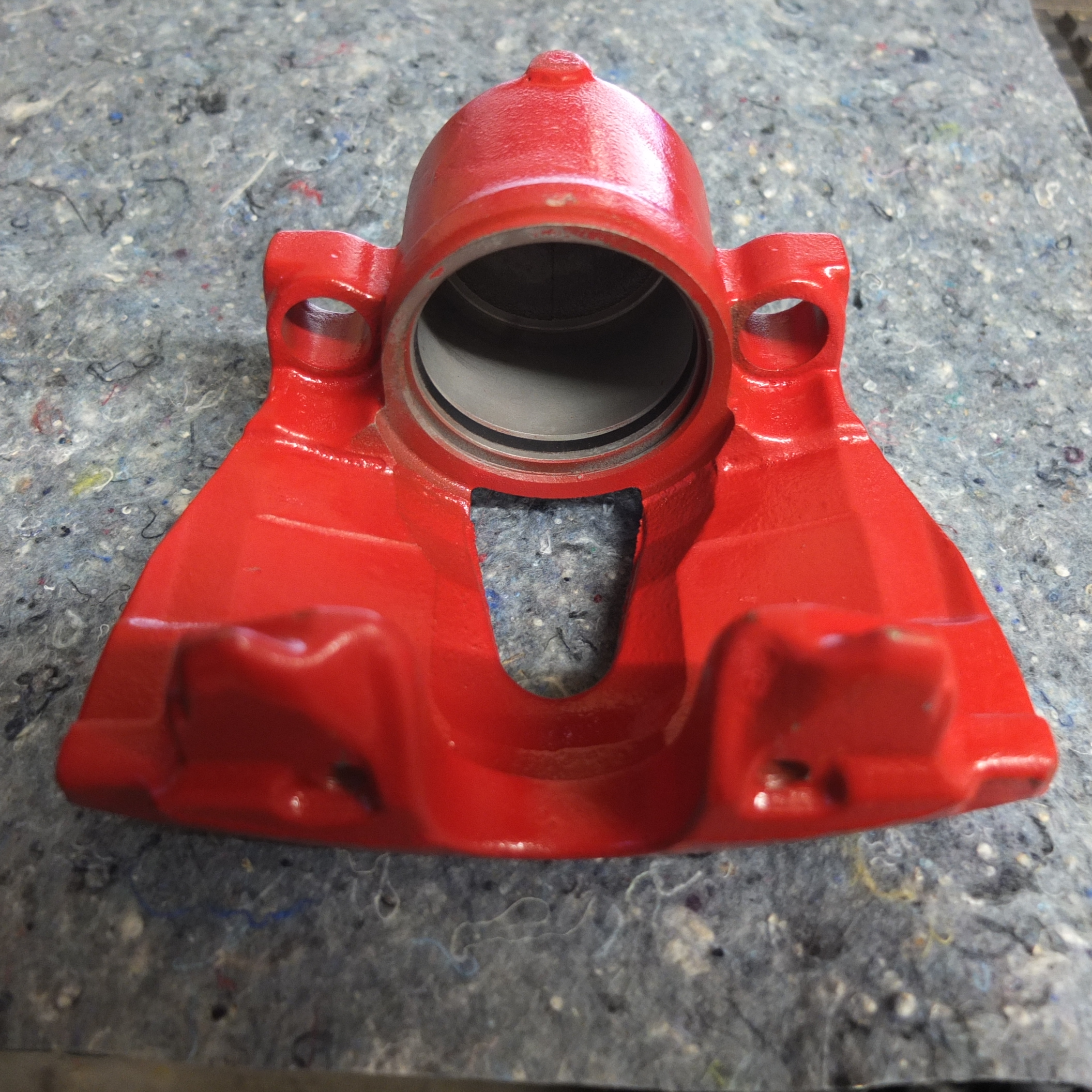 Die gebrauchten Sättel, Träger wurden Glasperlgestrahlt, anschließend mit Zinkgrundierung versiegelt. Der Bremssattellack 400 Grad ist aus Polen, drei Durchgänge. Eventuell ziehe ich noch 2 schichten Klarlack über den vorderen Teil des Sattels.