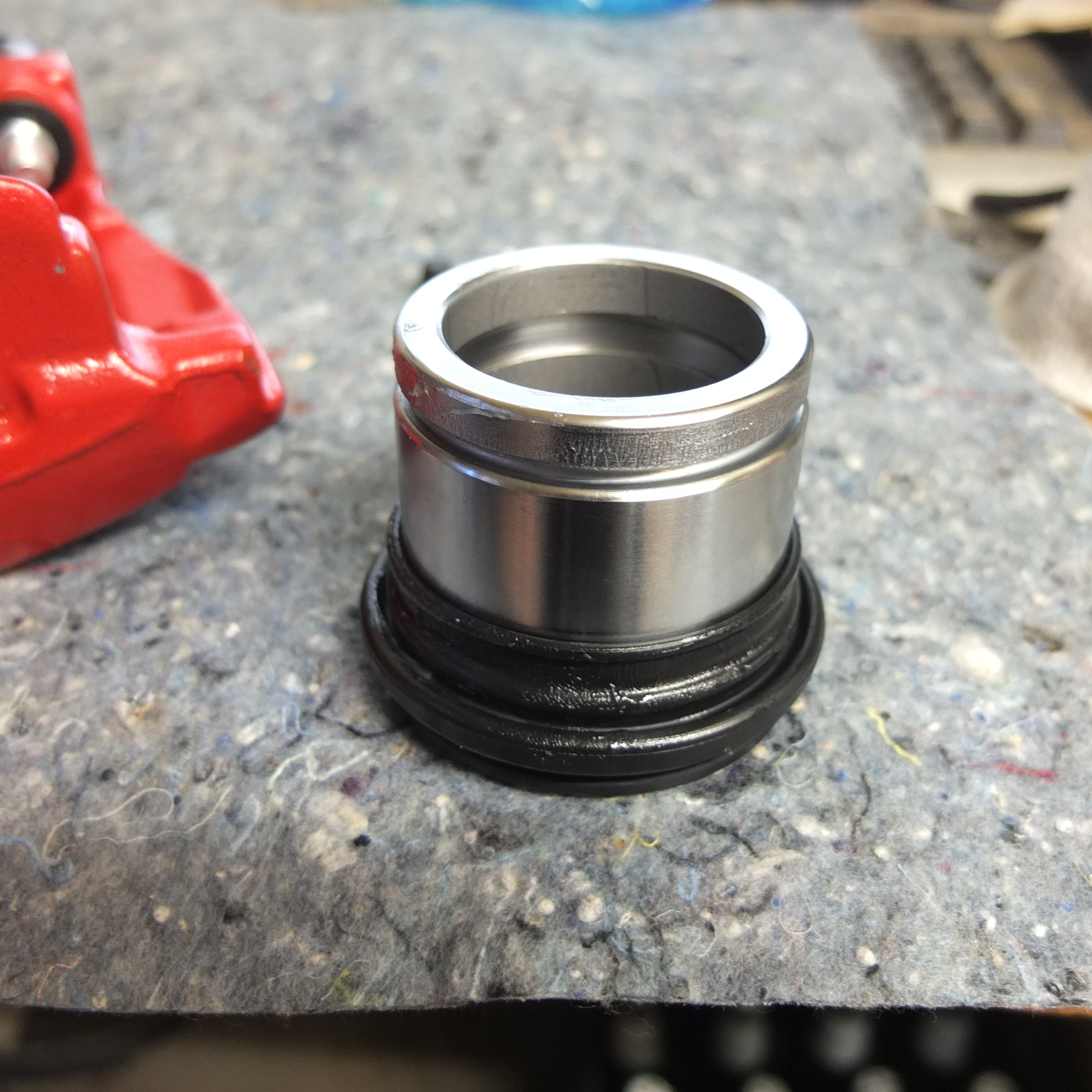 Dann wird der BremsKolbenring mit ATE Bremszylinderpaste fein eingerieben, eingesetzt, der Bremskolben auch eingecremt, die Dichtmanschette aufgezogen und eingesetzt. Ist ein bisschen fummelig.