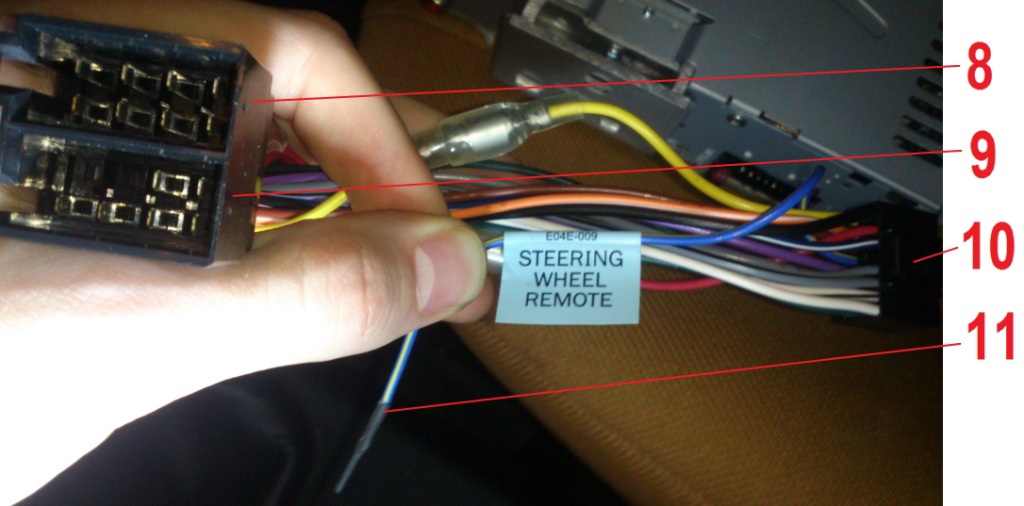 Der Stecker 10 kommt dann in den Anschluss 6 des JVC Radios.