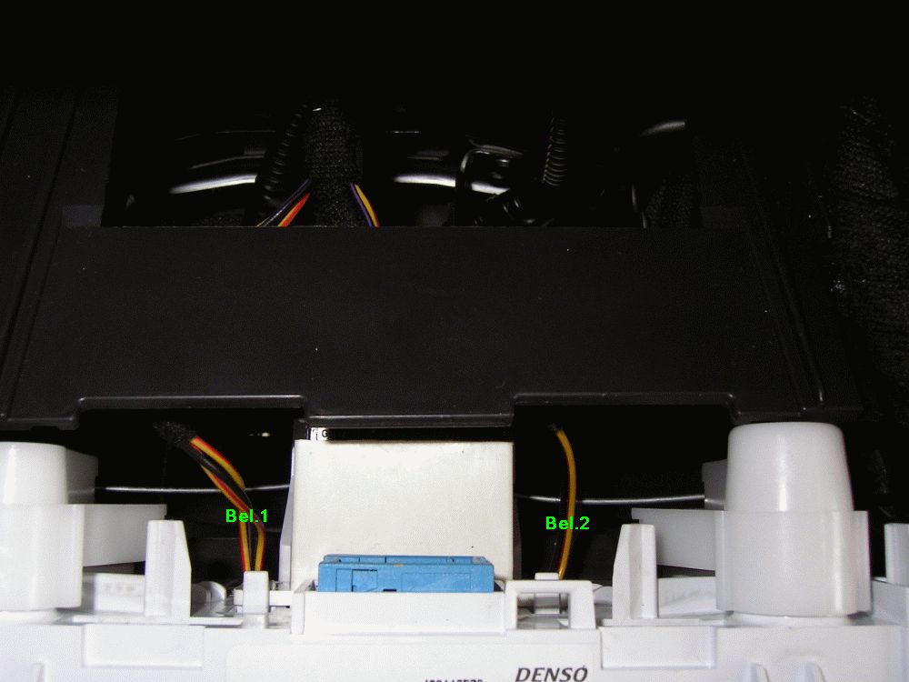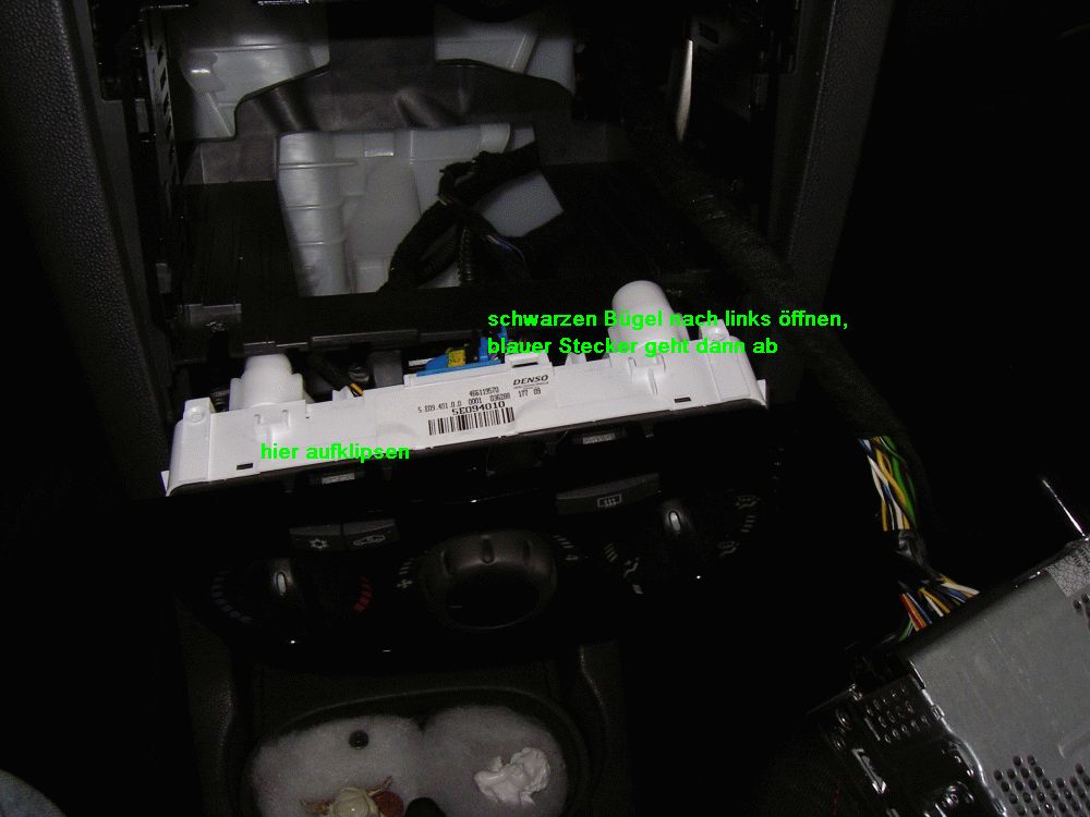ich möchte kurz beschreiben, wie die zwei birnchen der heizungsregler ausgetauscht werden können. am besten den radio mit 4x 3,5mm bohrer (oder rundmaterial) ausklipsen und heraus nehmen, die leitung ist lang genug, den radio einfach auf den beifahrersitz ablegen. nun die zwei schrauben mit einem steckschlüssel heraus drehen, mit einem flachen schraubendreher die zwei oberen rastnasen aufdrücken und mit etwas schmackes, das reglergehäuse von hinten herausdrücken, klemmt etwas. da ich die Heizungszüge nicht abmachen wollte, ist etwas wenig platz für die arbeiten vorhanden. man kann entweder die birnen mit der fassung nach hinten heraus nehmen, dazu ist aber etwas geschick und kraft erforderlich, weil die fassung mit zwei rastnasen im gehäuse steckt. ich habe einfach die vordere klavierlackblende abgemacht, dazu einfach die rastnasen mit einem schraubendreher aufdrücken und dann vom weißen teil abnehmen. den blauen stecker abmachen, dazu den schwarzen bügel nach links drücken und der stecker kommt von alleine heraus. jetzt kann die elektronik mit lichtleiter abgemacht werden und man kann die lämpchen von vorne austauschen, oder gegen led's ersetzen. Einbau in umgekehrter reihenfolge vornehmen. viel spaß !!!