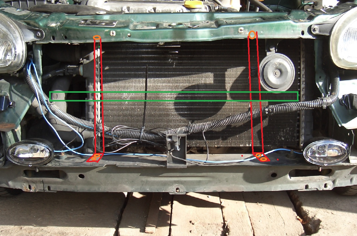 Möglich wäre auch, eine Art Bügel zu basteln, dessen oberes Ende an dem oberen vorderen Querträger befestigt ist (wo das Motorhaubenschloss ist) und unten von der Plastikstoßstange lediglich gestützt wird.
