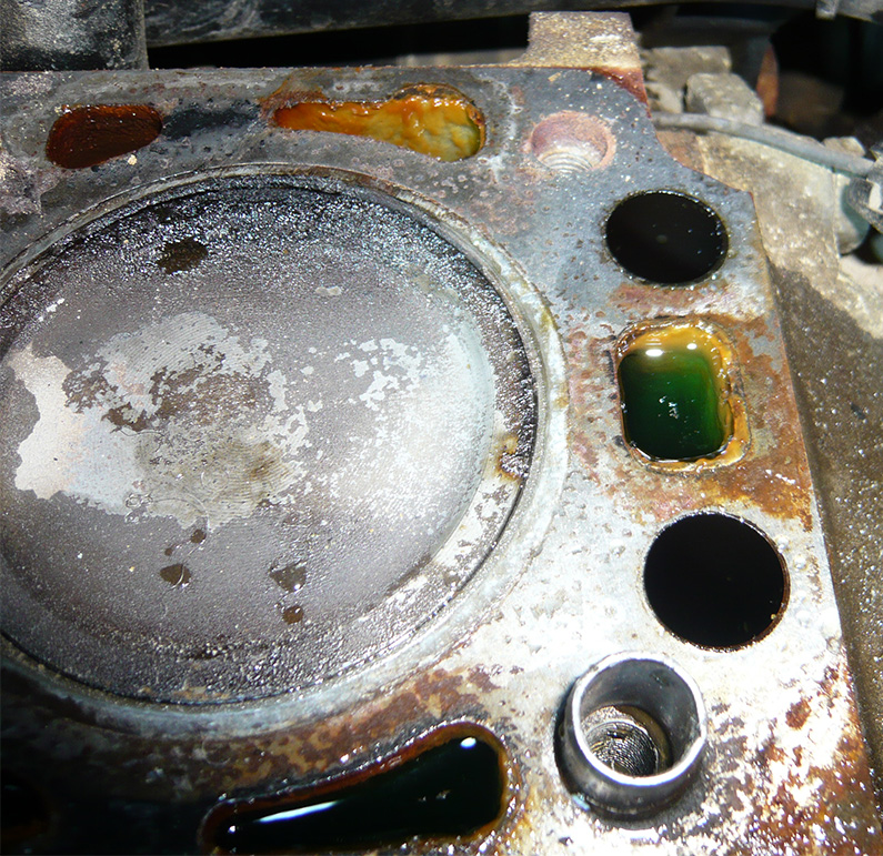 Als ich dann den Zylinderkopf runter hatte, lief aus mehreren Löchern sowohl rotbraune als auch grüne Flüssigkeit. Rechts auf dem Bild erkennt man gut noch die Farbe. Die grüne Flüssigkeit ist richtig klar, da ist kein Öl und nix drin. Und das eigentliche Kühlmitttel ist bei mir blau.