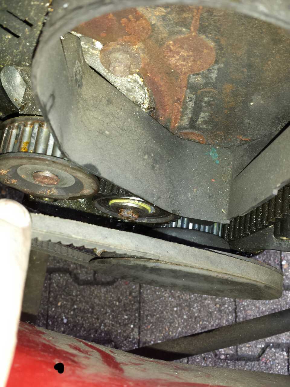 Ganz unten am Motor hast du die Riemenscheibe: Ratsche nehmen, auf die mittige Schraube setzen und ganz vorsichtig den Motor im Uhrzeigersinn drehen (Gang raus!).