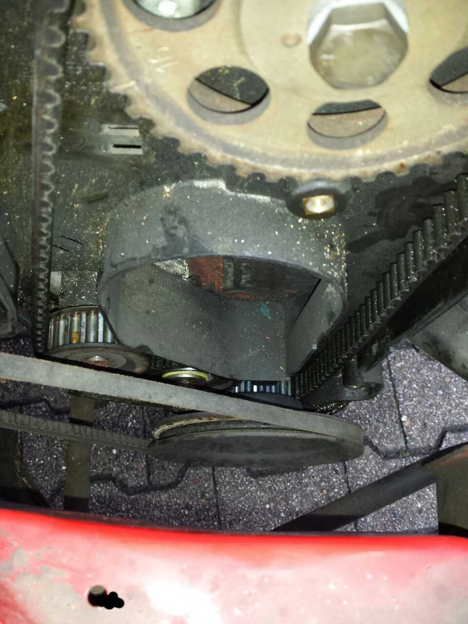 Wenn du dir unsicher bist, musst du die Riemenscheibe unten abschrauben und abnehmen. Dann hast du das Zahnrad vor dir, auf dem der Zahnriemen sitzt. Schau es dir genau an: du wirst einen kleinen Punkt auf einem der Zähne finden: dieser muss auf 6 Uhr zeigen.