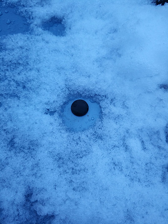 Hart gefrorene Schneeoberfläche, die mich locker trug und meistens auch mein Auto. Aber nicht beim wenden und lenken. Der Schnee war so tief, dass ich gleich mit dem Motorraum unten aufsetzte. Schaufeln half da nicht viel. Inzwischen hatte sich die Subaru Familie (Mann schaufelte, Mutter und kleine Tochter schauten zu) unter lauten Freudengejohle freigeschaufelt und geruckelt. Die hatten auch versucht, den Parkplatz zu erreichen. Das scheint aber nur für den Sommer vorgesehen zu sein. Die haben dann bei mir gehalten und nach ein paar Minuten war ich auch wieder frei. Das erste Mal seit Jahren festgefahren... peinlich ;)