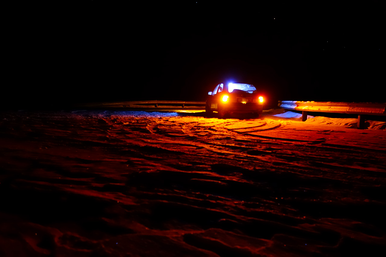 Aber, es wird sich geholfen. Ein beruhigender Ansatz für die Rückfahrt durch Schnee und Eis bei Nacht...
