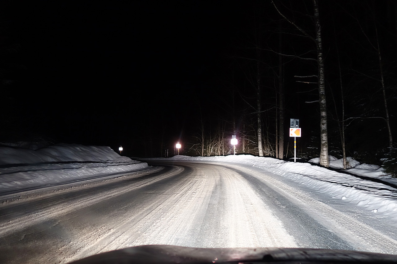 Meine erste Tour mit den Reifen beinhalteten 150km Achterbahn-ähnlich Straße mit Kurven um unendlich viele Karelische Seen. Und das nachts bei deutlichem Frost.