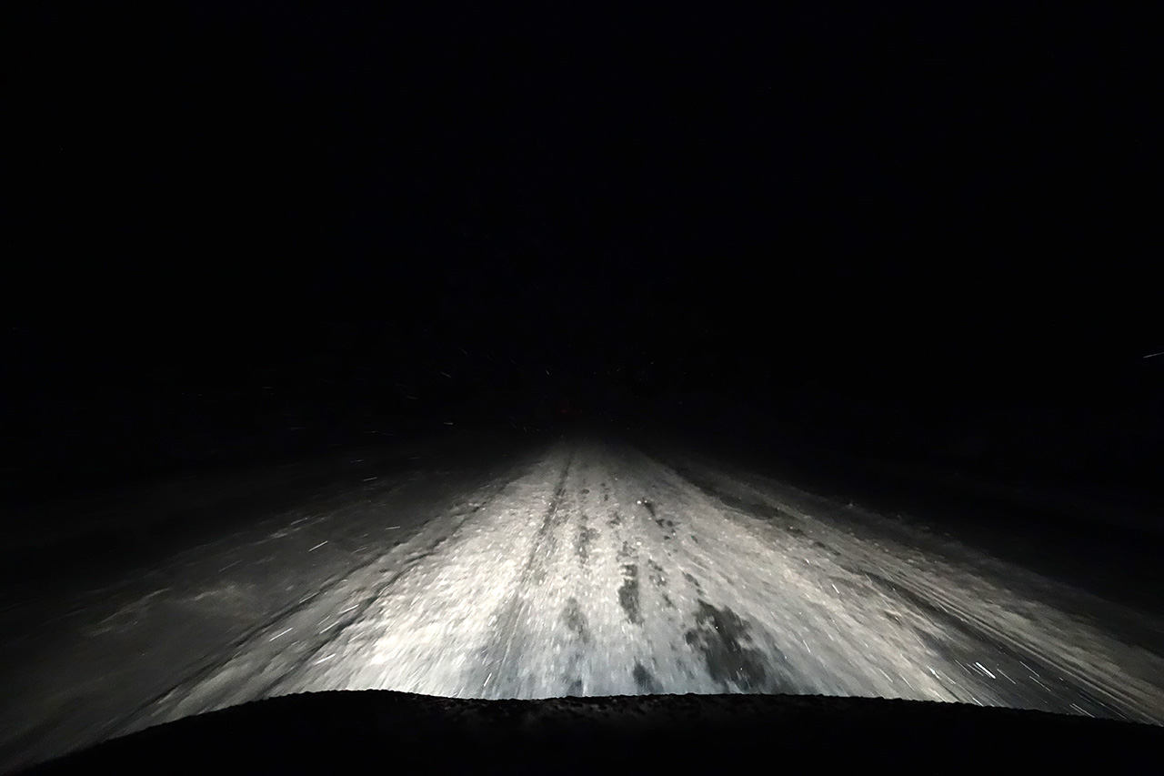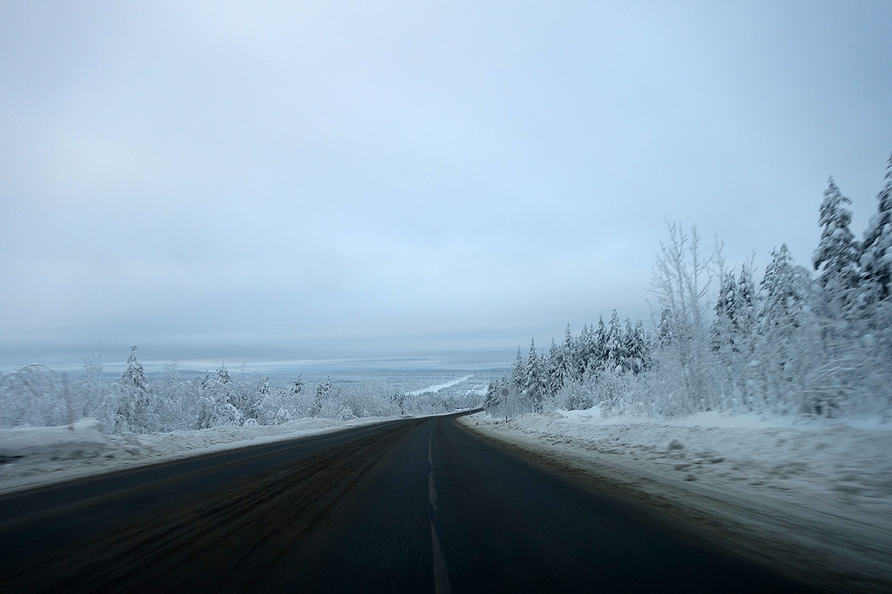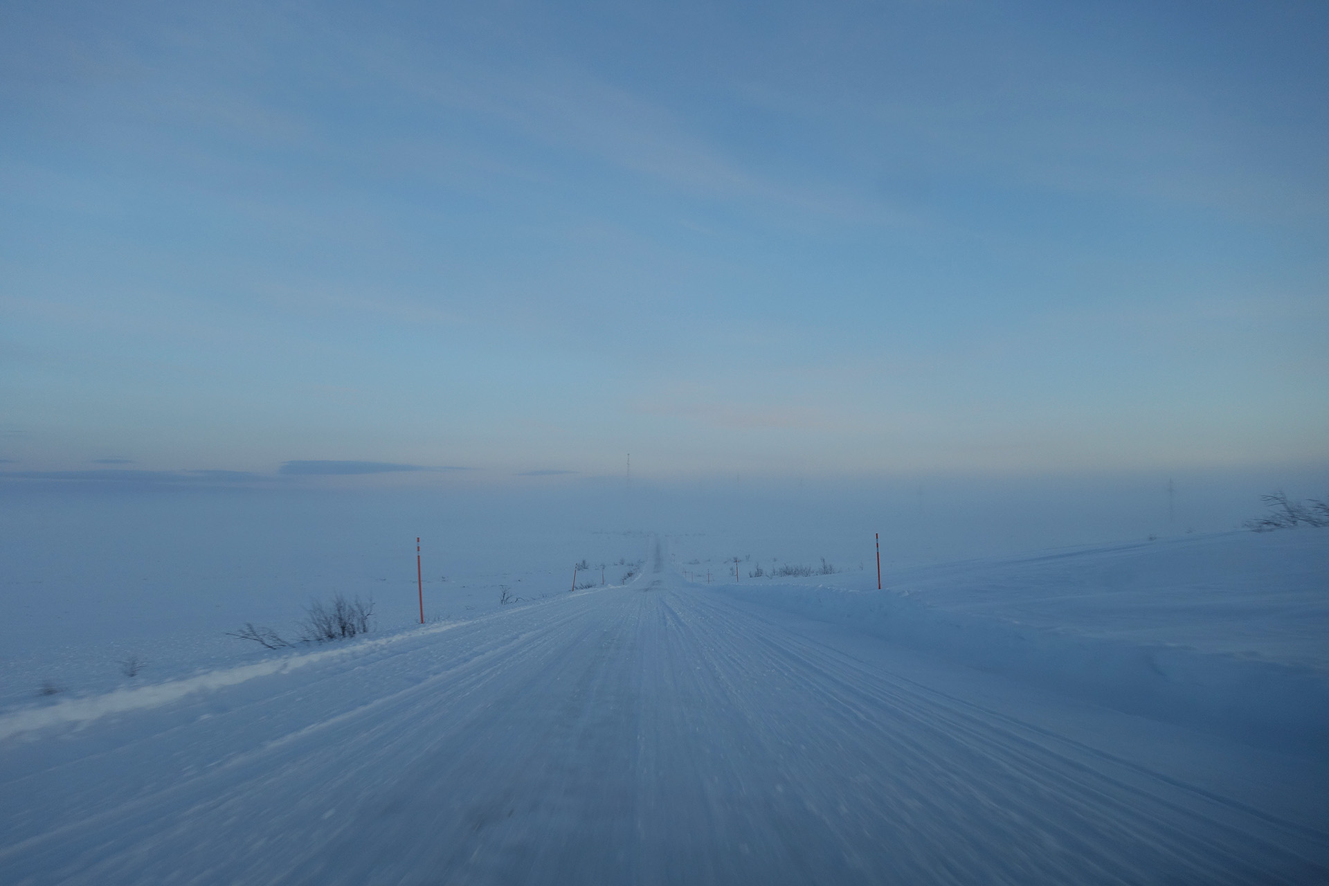 Die Straße dahin führt 130km durch menschenleeres Gebiet, aus Tundra wird langsam Polarwüste. Ca. 1/4 der Strecke ist vom Mobilfunk abgedeckt. Etwas spannend ist das schon, durch Schnee und Eis allein da hin zu fahren. Das war aber nur die Aufregung vorher, weil man nix von den Umständen weiß. Im Nachhinein war alles einigermaßen entspannt. Und es war unglaublich schön. Stundenlang durch unendliches Weiß zu gleiten. Tempomat 60km/h war (mein) Maximum und selbst damit ging es ab und zu im drift um die Kurven.