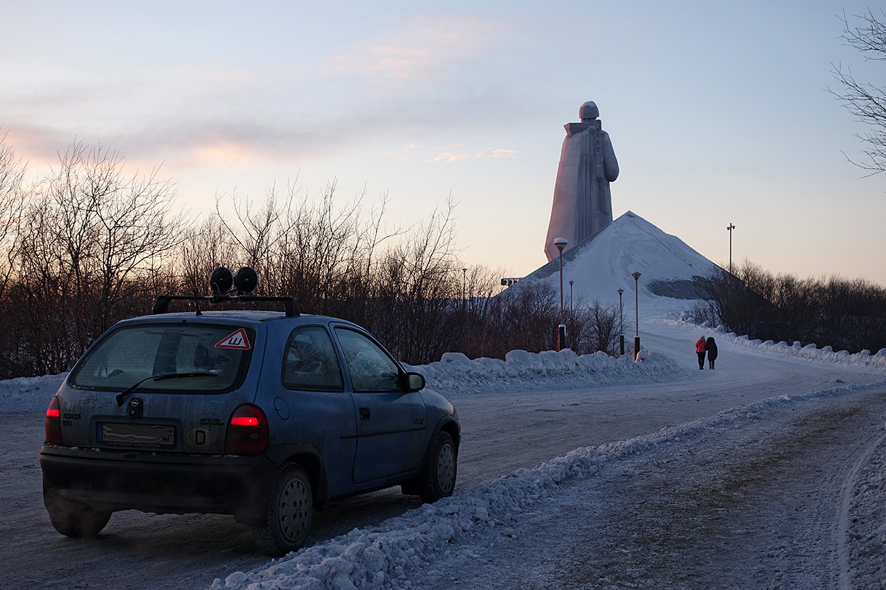 Auch Fans finden sich. Jevgeni hat mein Auto schon vorm Hotel stehen sehen und hat mich nun beim FotoShooting "Corsa mit Panzer" entdeckt. Der kriegte sich gar nicht wieder ein, dass ich aus DE mit dem kleinen Auto bis hierher gefahren bin. Seine Frau lief entnervt weiter, er selber hatte Einkaufstüten und leere Kanister unterm Arm. Einmal kurz über das Leben, DE+RU, Politik, Reisen, Sport, Autos... gesprochen, dann gleich das du angeboten und eine Einladung zum Tee erhalten. Wie so oft. Super nett :D Ich habe dankend abgelehnt, da ich noch ein bisschen Strecke vor mir hatte. Wir hatten uns unterhalten, was so meine nächsten Ziele sein werden, Murmansk war die nächste Stadt. Daraufhin rief der seine Tochter Aljonka (Bänkerin) in Murmansk an: "Ich stehe hier mit einem guten/netten deutschen Mann, willst du dem in den nächsten Tagen nicht mal die Stadt zeigen?" Die Reaktion am anderen Ende der Leitung war wohl die gleiche, wie sie in dem Fall sicher jede Tochter auch gehabt hätte. "Ähm... also... also Vater!... mal sehen...".
