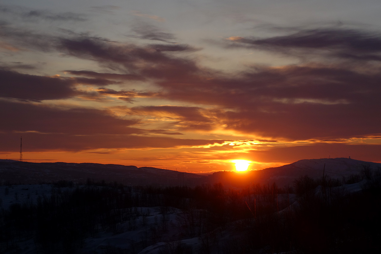 Die Polarnacht ist gerade zu Ende. D.h., die Sonne schaut jetzt jeden Tag ein paar Millimeter mehr über den Horizont. Es ist ungefähr von 10.30-15.30 Uhr wie andauernde Dämmerung, der Rest ist Nacht. Aber diese Zeit der Sonne taucht die Landschaft in herrlichste Farben. Physik at it's best!