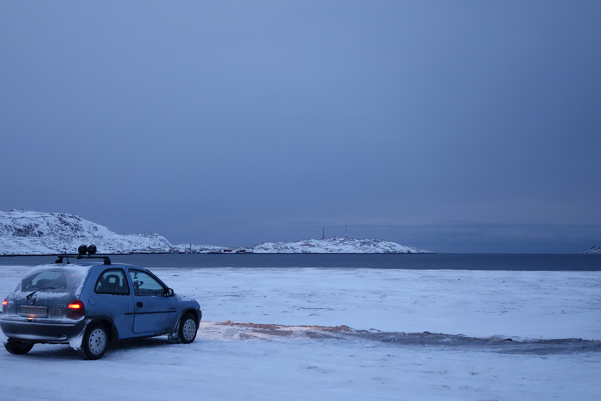 Direkt hinter dem Ufer an der Barentssee war ein Parkplatz eingezeichnet. Ca. 2km hinter dem Ort. Der Weg ging so, war eben ein hügeliger Feldweg mit ordentlich Verwehungen. 500m vor dem Parkplatz stand ich in einer Müllhalde, aber mit einem Weg hindurch. Der Schnee wurde tiefer, nichts mehr geräumt. 200m weiter vorn sah ich einen feststeckenden 4WD Subaru, deren Besitzer am eifrig schaufeln. Gut, das muss ich nicht haben, dachte ich und drehte um. Und zack, steckte ich auch fest :D
