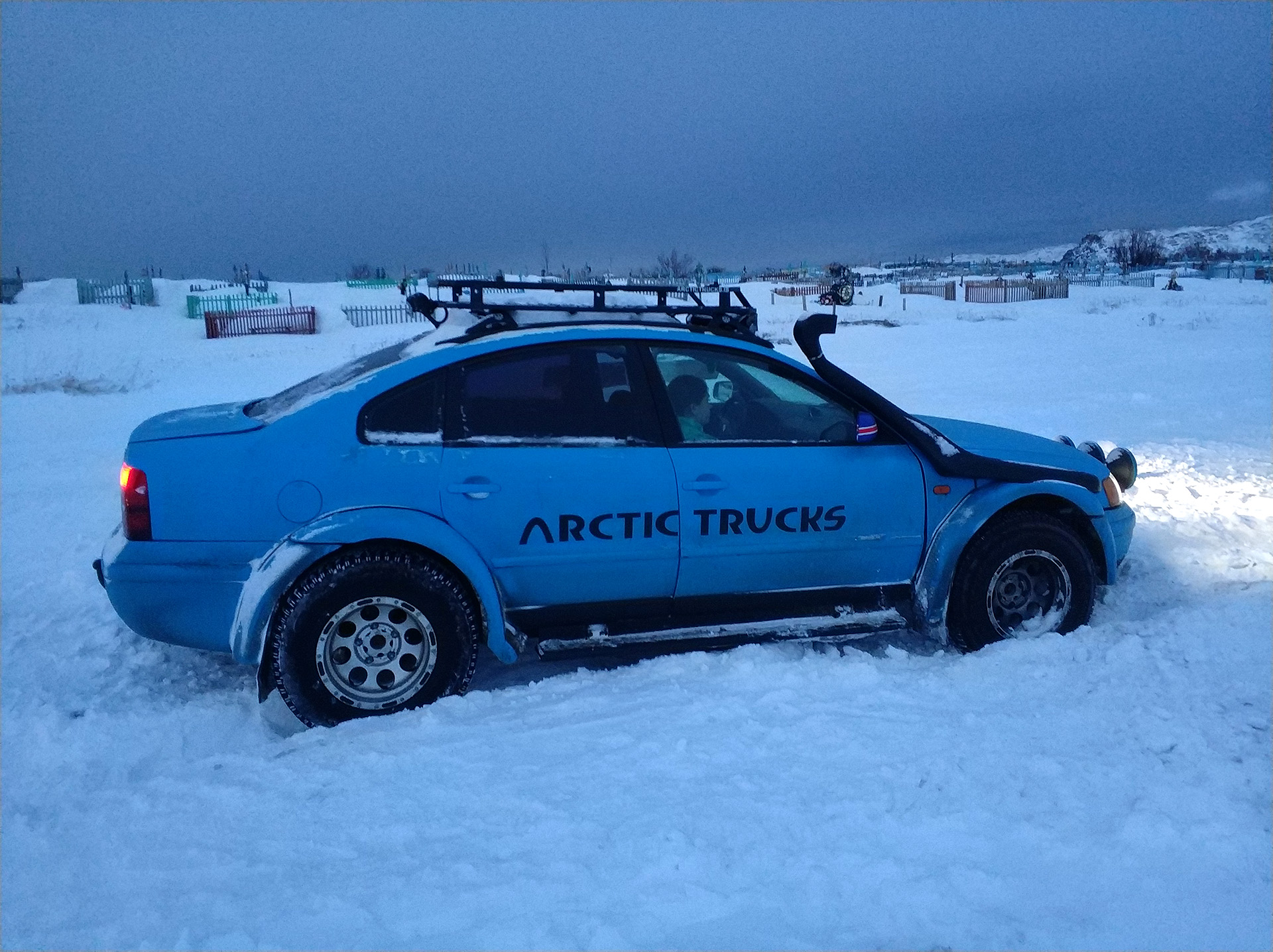 Ein super aufgemotzter Passat B5, mit riesigen Reifen (die beim lenken bedenkliche Kratz- und Klappergeräusche verursachten), Scheinwerfern, Schnorchel usw. Machte was her. Der Fahrer sagte, kein Problem, lass uns hinfahren. Die sind losgefahren - und steckten 20m weiter im Schnee fest :D