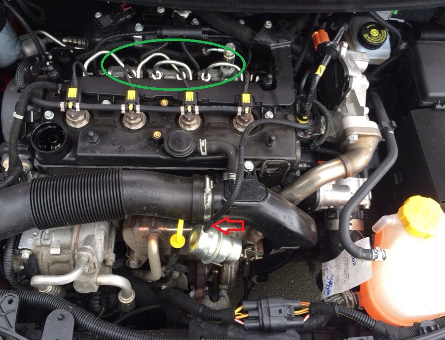 Genau sagen, kann ich dir das leider auch nicht. Auf dem S/W Bild ist die Position vom Ladedrucksensor (roter Kres) angegeben, was dem grünen Kreis in deinem Bild entsprechen sollte. Da müssten dünnere Leitungen hinführen (ich kann da auch welche erkennen, musste mal schauen ob die in einem Teil mit Stecker enden :D).