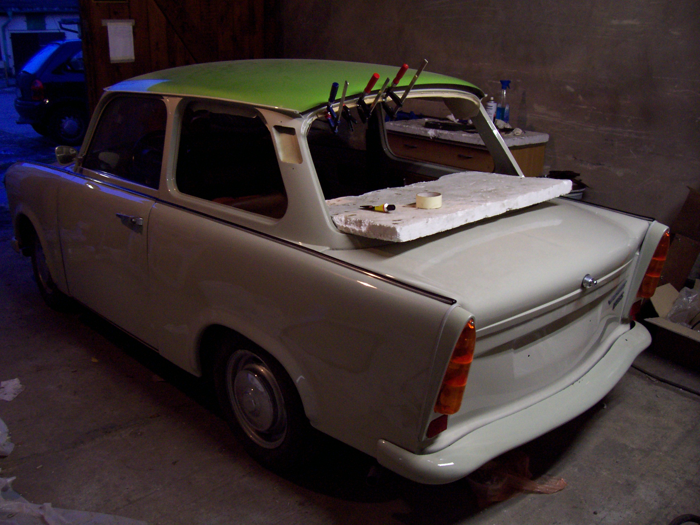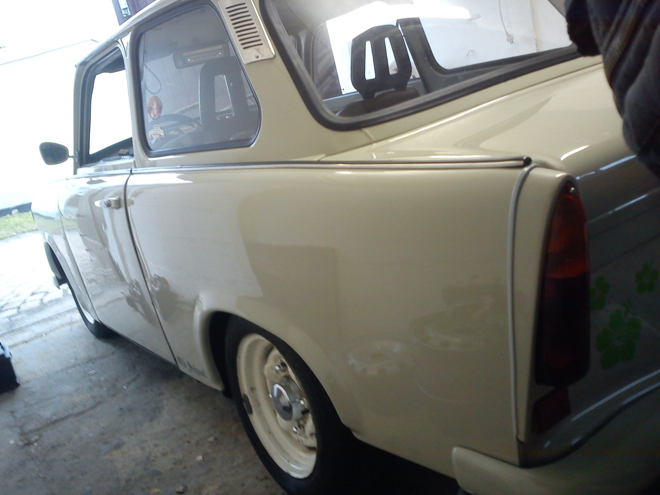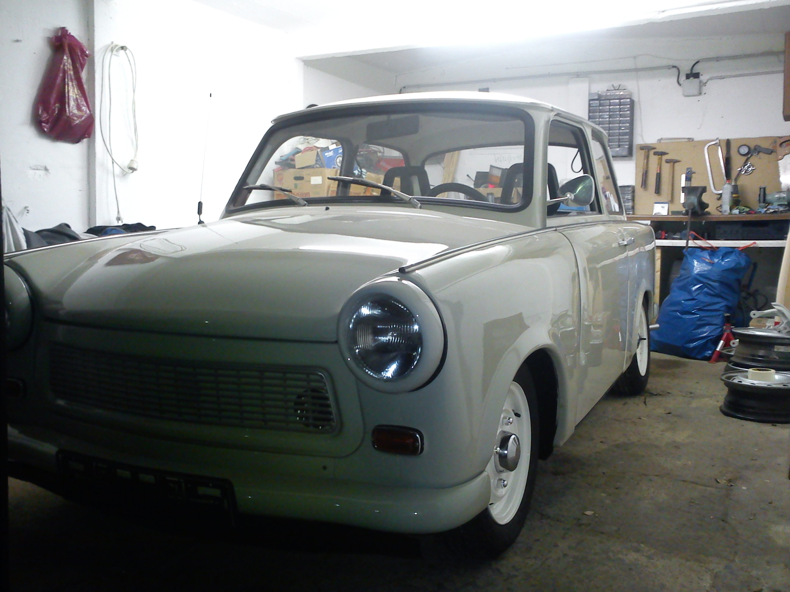 Dies geschah dann auch, erneuert wurde fast alles, Lack, Unterboden, Fahrwerksteile, Bremsen, Innenraum teils neu. Quasi alles neu bis auf Motor, Getriebe und Hilfsrahmen auf dem der Motor sitzt. 2008 verkaufte ich den kleinen schließlich (warum weiß ich selbst nich). Der Käufer ließ dann anschließend den Motor noch regenerieren und tunen, von wahnsinnigen 26 auf wahnwitzige 36PS ;) , den Hilfsrahmen, Querlenker vorn, etc. strahlen und pulvern. Eigentlich hat er all das noch überarbeitet was ich damals im Altzustand belassen hatte. Vor ein paar Wochen schau ich dann abends bei mobile rum und finde durch Zufall meinen Trabant im Netz. Also angerufen, hingefahren, gekauft und heut dann abgeholt. Nun isser wieder mein und wird auch so schnell nich mehr verkauft. Im Frühling wird dann noch die Hauptuntersuchung gemacht und dann wird er endlich zugelassen. Paar Kleinigkeiten sind noch zu machen, die sind aber eher optischer Natur.