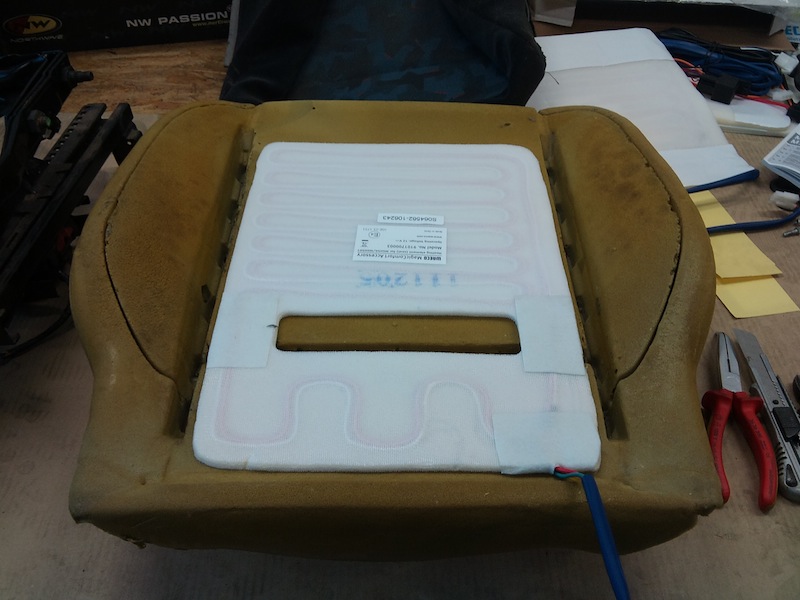 Das wars auch schon. Die die Rückenlehne ist deutlich einfacher, hier muss man nur unten eine Schiene lösen (genau anschauen, da ist ein Widerhaken drin) und den Bezug etwas hochschieben. Dann das Heizelement mit den Klebestreifen nach hinten reinschieben und fixieren.