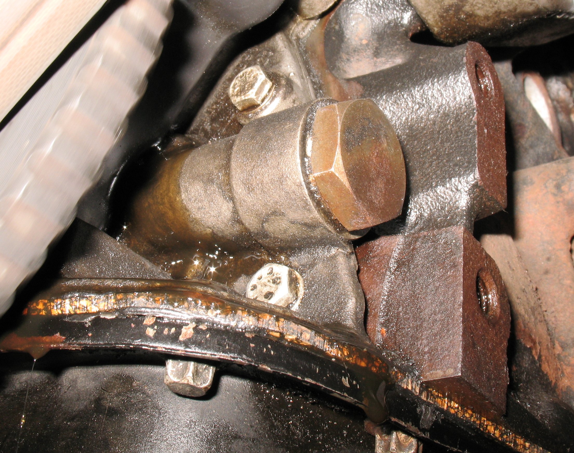 Ich denke mal die Stelle an der die Suppe runter kommt kann man hier gut erkennen, bloß woher ? Ölwannendichtung ? Desweiteren, ist diese gleichmäßige längliche Wölbung der Ölwanne normal oder is die eingedrückt ?
