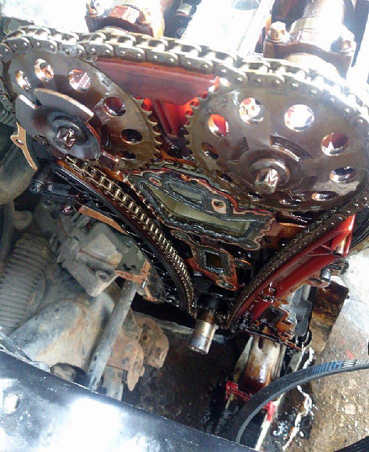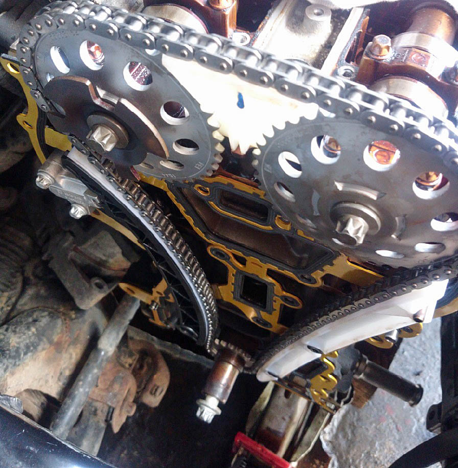 Symptome: kurzes Rasseln direkt nach dem Start, im warmem Zustand rhythmisches Tackern und Rasseln aus Richtung des Kettentriebes (Motorseitig rechts).