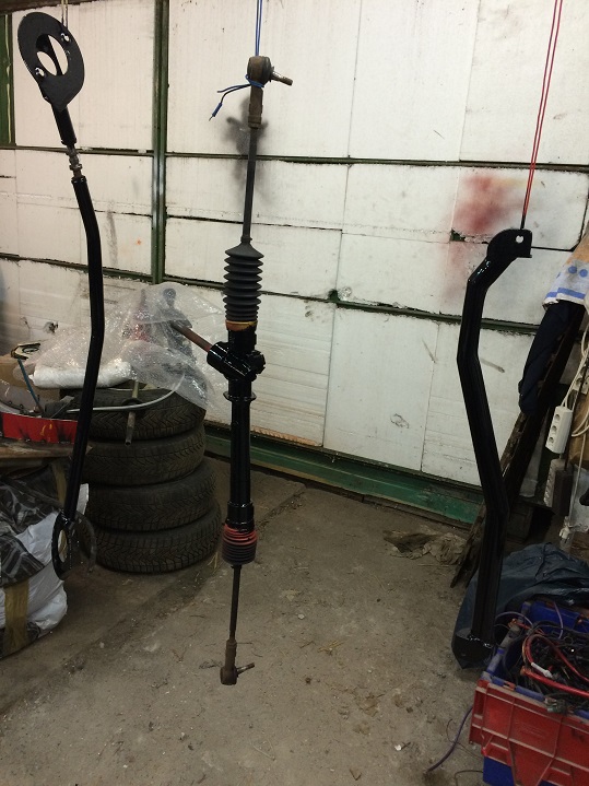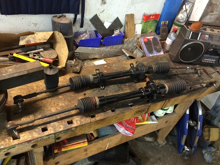 Das frisch gelackte Lenkgetriebe wartet zerlegt und frisch gefettet auf neue Spurstangen und -köpfe.