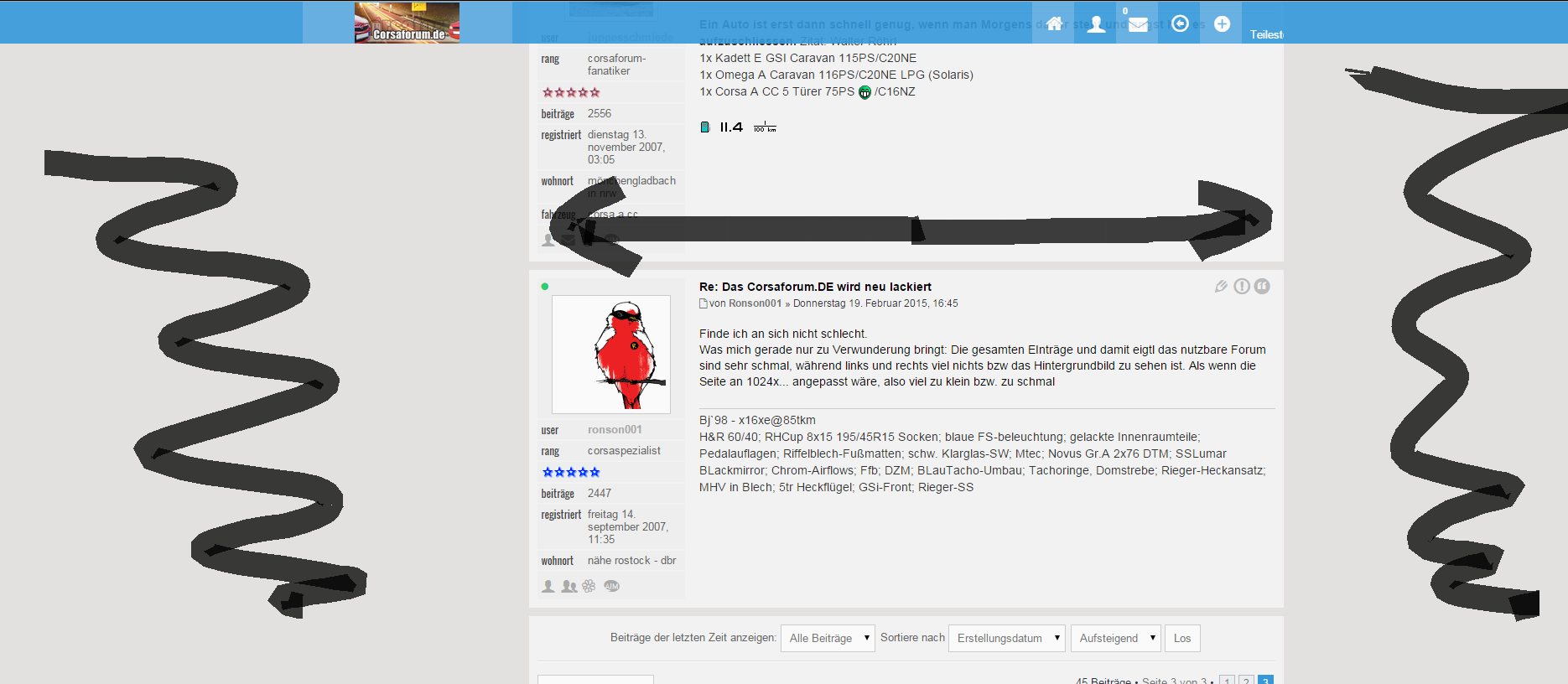 Was mich gerade nur zu Verwunderung bringt: Die gesamten EInträge und damit eigtl das nutzbare Forum sind sehr schmal, während links und rechts viel nichts bzw das Hintergrundbild zu sehen ist. Als wenn die Seite an 1024x... angepasst wäre, also viel zu klein bzw. zu schmal