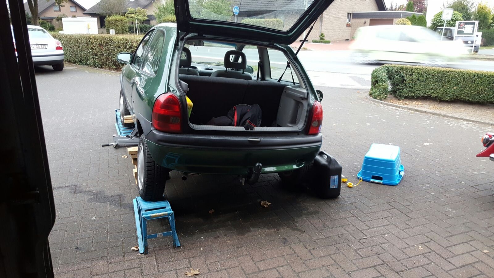 Habe den Wagen dann links Schritt für Schritt hochgebockt und unterlegt.