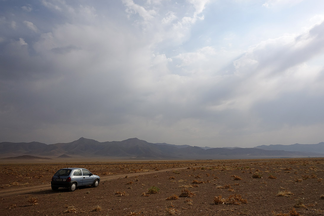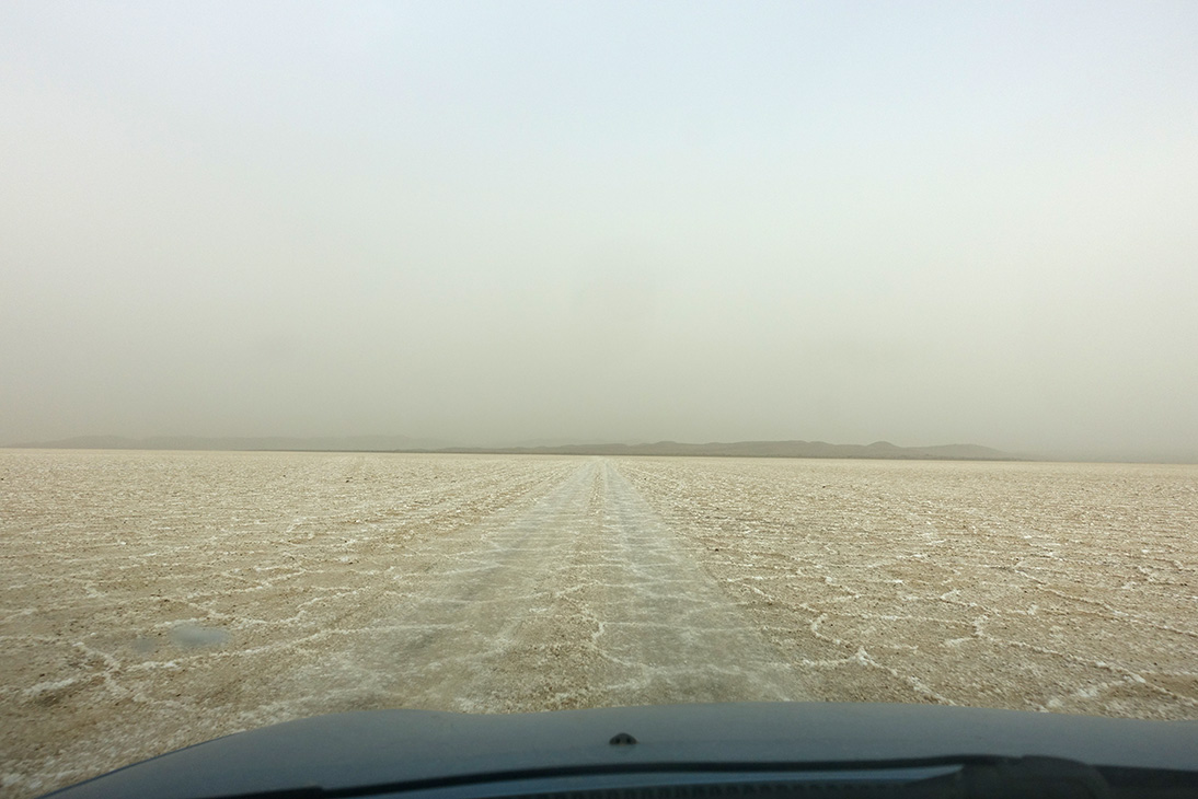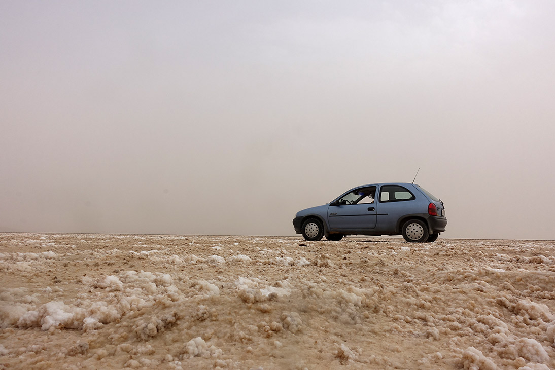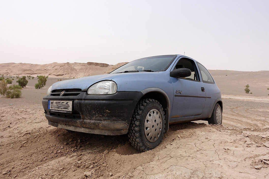 Vorgestern war ich den ganzen Tag in der Zentralwüste unterwegs, (das beinhaltet verschiedene Arten von Beschaffenheit: Sand mit Sträuchern, feiner Fesch-Fesch, Geröllwüste, schwarzer Sand mit fiesen spitzen Steinen, Felsen mit Feinsanddünen, hell-weiße, oberflächlich zu einer harten Kruste erstarrter Staubschicht, darunter super weich, Felsen, Erde, Salzsee uvm...). Mittendrin ist ein Salzsee mit ca. 50km Durchmesser, in dessen südlichem Teil eine Insel liegt. Je nach Wetterlage kann man durch den See bis da hin fahren. Und das Wetter hat gepasst. Später zog dann ein Sandsturm auf. Harte Arbeit für den Corsa, hat er aber alles bestens bewältigt!