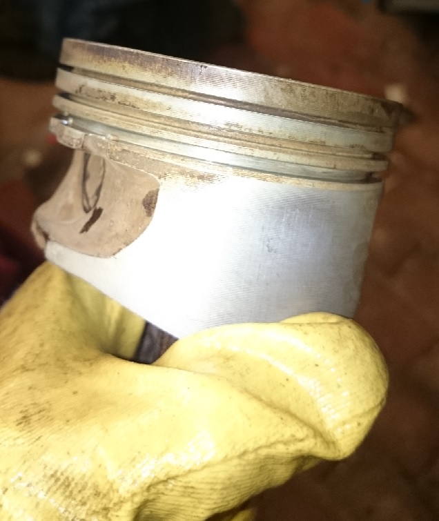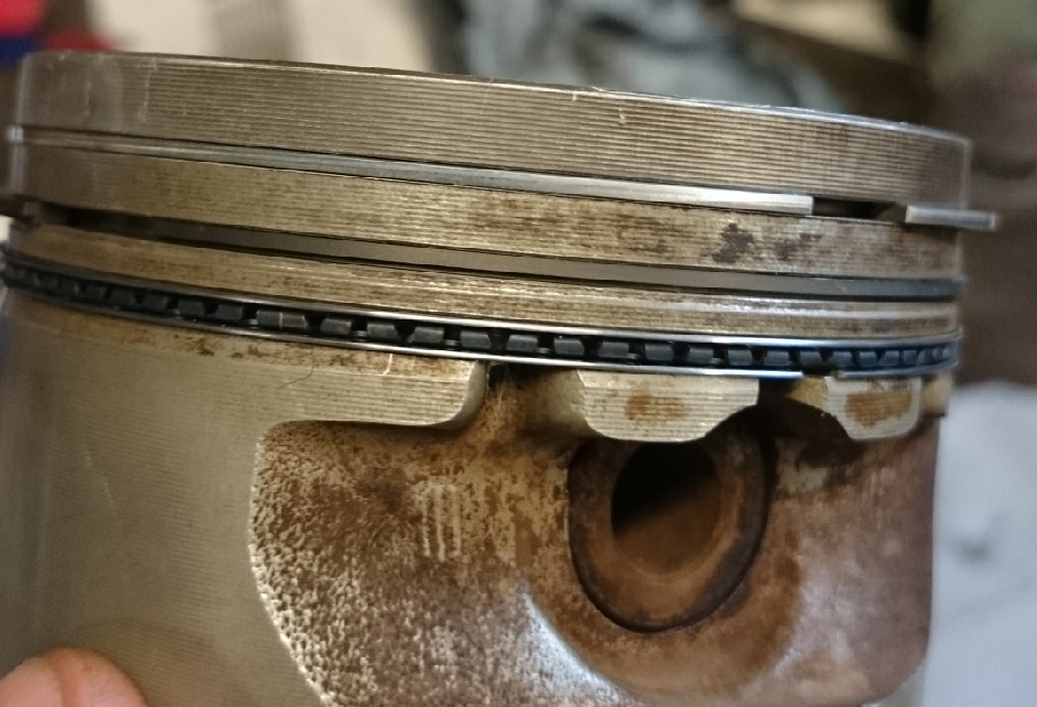 Da die Kolbenring (die oberen beiden) mit ca. 5 bis 15 U/min rotieren, backen die nicht fest und auch die Nuten sind nicht zugeschmockt.