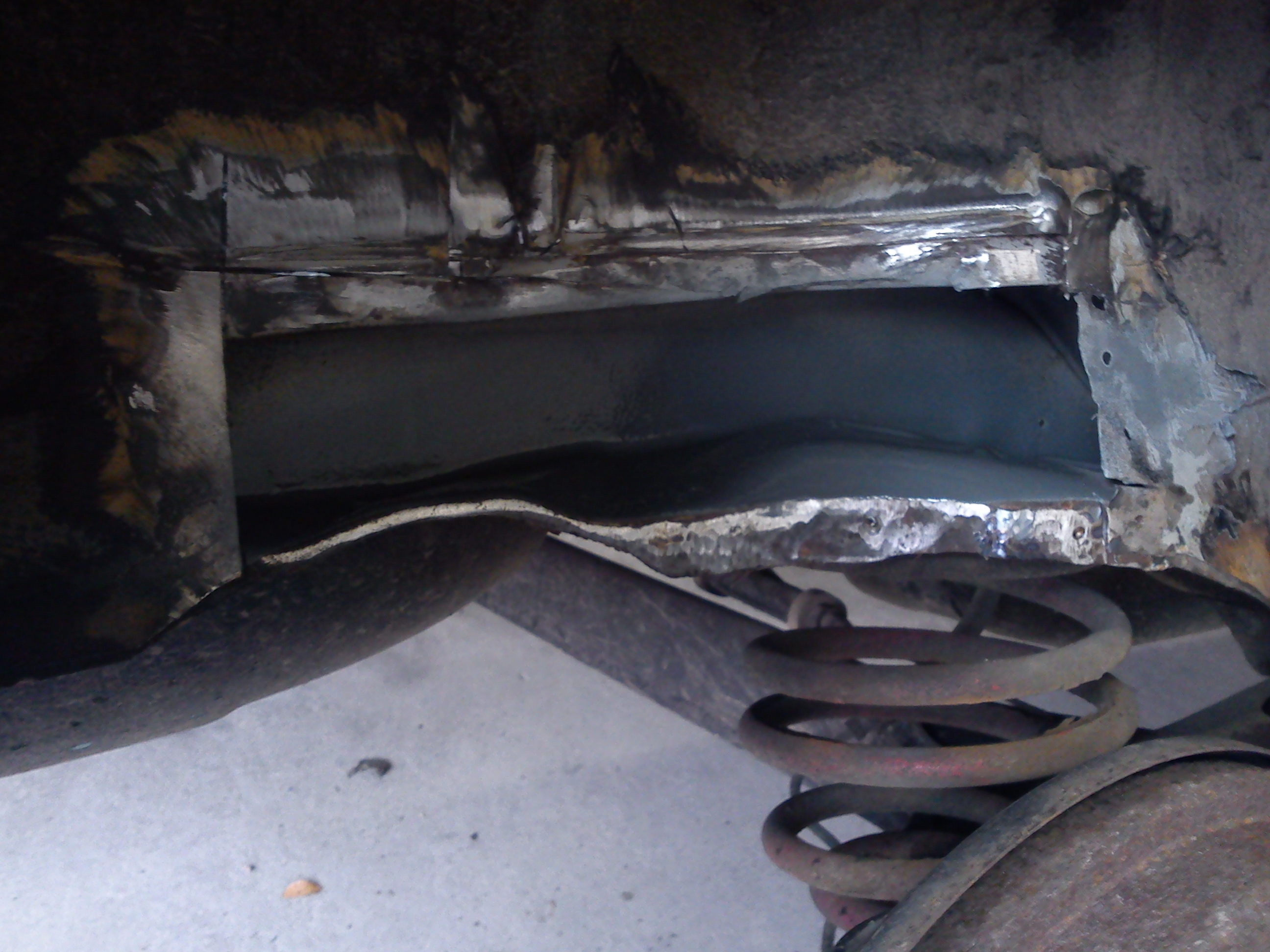 War schon ganz schön verfault. Das gute aber, der Träger an dem die Federaufnahmen dran sind sieht von innen noch ganz gut aus, auch das restliche Blechle stand noch halbwegs gut da.