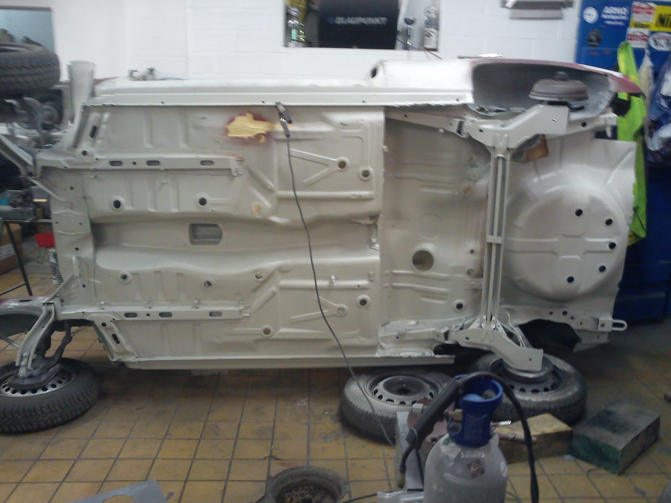 Hab heut mein Langzeitprojekt vom strahlen wieder abgeholt, hatte den Unterboden zwar mit´n Heißluftfön und Spachtel so gut wie´s ging vom Unterbodenschutz befreit, aber so isses letztendlich doch gründlicher. Wurde gleich noch mit EP Grund beschichtet, glaube besser kanns nich sein! Nun kanns mit den Schweißarbeiten los gehen!