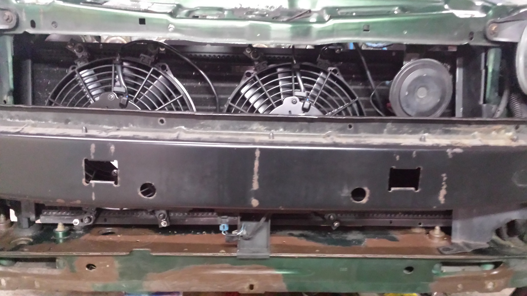 Thema Kühlung ist abgeschlossen...alle Kühlerschläuche sind verlegt, großer Kühler ist verbaut...dazu zwei blasende Spal Lüfter von Vorn, damit im Motorraum mehr Platz ist. Wirkt außerdem optisch auch etwas ansprechender