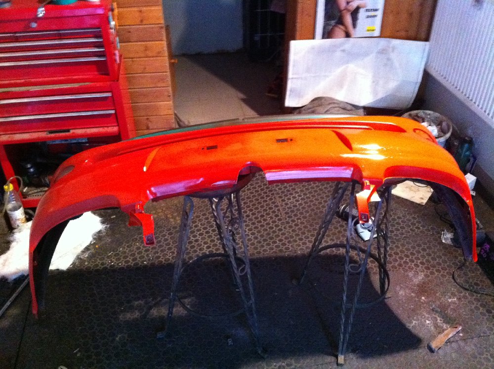 Also Stoßstange ab, gespachtelt, geschliffen, grundiert und lackiert.