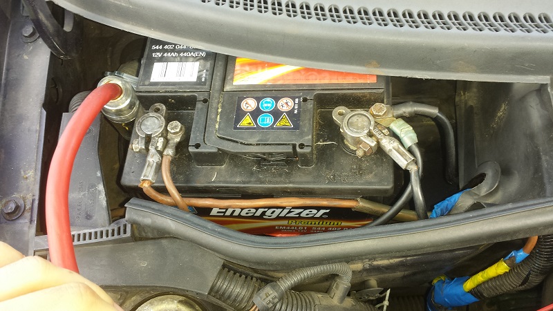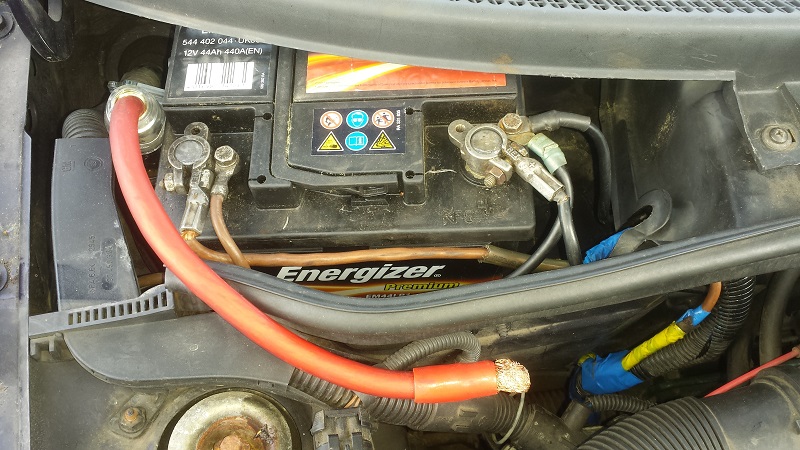 Das Minuskabel ist an den hinteren Sitzen fest gemacht, an der Befestigung.
