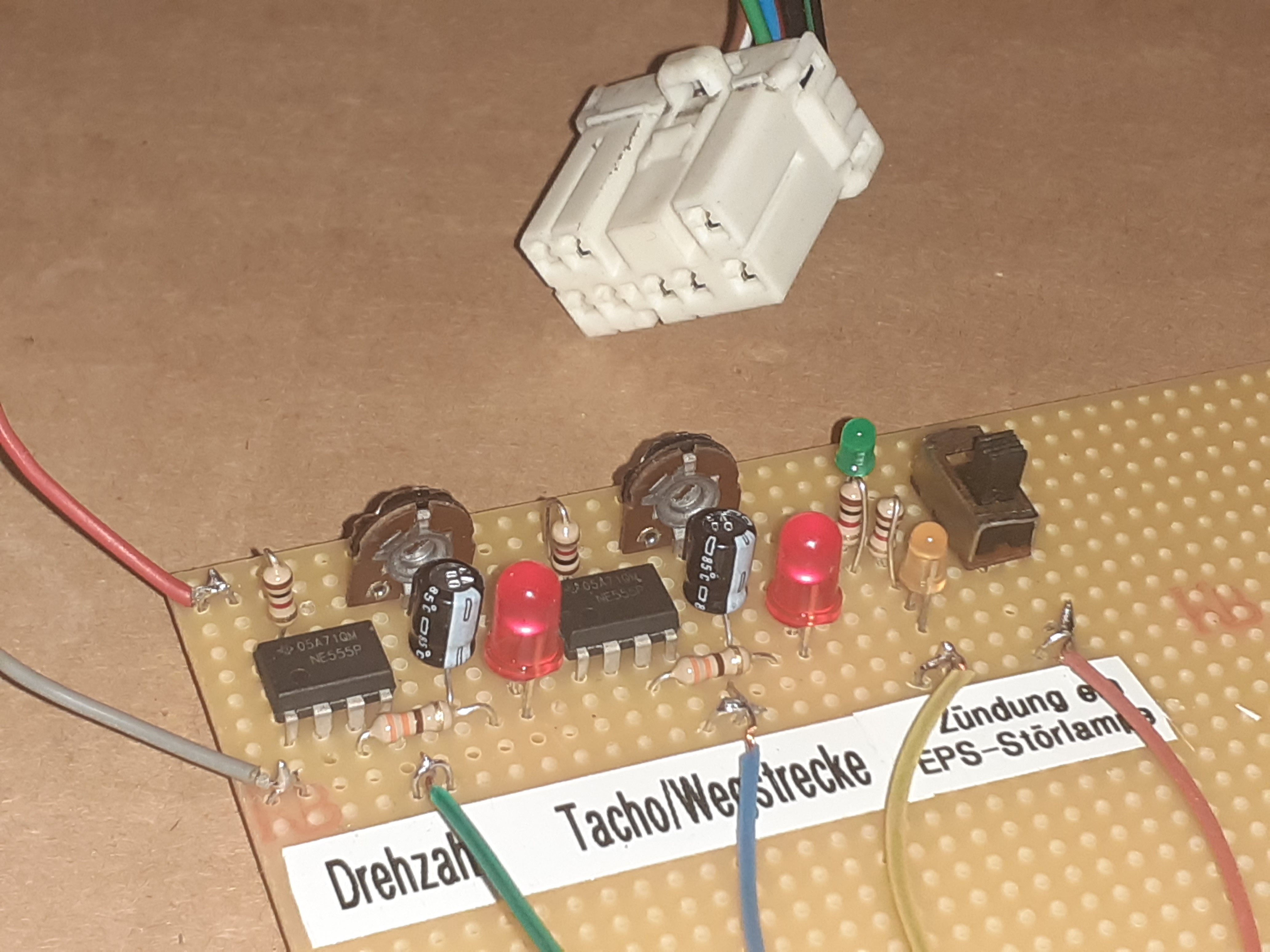 Ich habe noch die EPS-Störlampe (gelbe LED) und einen Schalter für Zündungsplus sowie eine Kontroll-LED (grün) dafür ergänzt.
