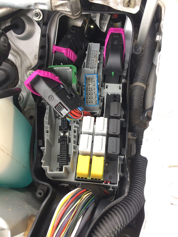 Beim offenen BCM-Gehäuse und laufendem Motor mal am Modul und Relaisträger gewackelt. Siehe da, der Fehler lies sich hervorrufen und auch wieder abschalten. Also alle Relais und das Modul einzeln herausgenommen und die Kontakte gereinigt und mir Druckluft ausgeblasen. Bild 2.