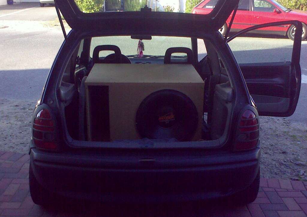 achso .. wenn der woofer und der port (bassreflexrohr) nach hinten egegeen die kofferraumklappe spielen ist es lauter als in jeder anderen stellung im corsa