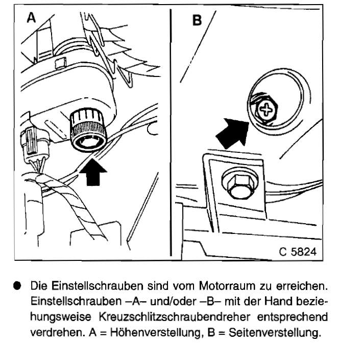 Für hoch/runter sitzt am Motor der Leuchtweitenregelung ein weisser Drehknopf, der mit der Hand eingestellt wird