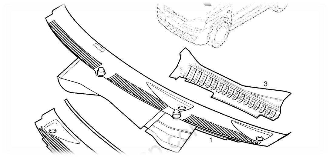 Die Verkleidung besteht aus zwei Kunststoff-Teilen, die jeweils links und rechts im Motorraum mit Torx-Schrauben (5) befestigt werden. Die dritte Schraube soll oben auf der Verkleidung eine Plastiklasche halten/fixieren. Frage: Die Verkleidung müsste eigentlich leicht zusammengedrückt werden, damit die Aussparungen für die Scheibenwischer passgenau sitzen. Die Schraube in der Mitte wird in eine Plastik-Spreizmutter (4) eingedreht, die Verkleidung rutscht aber wieder auseinander - sprich: Kein Halt. Ist das so gewollt?