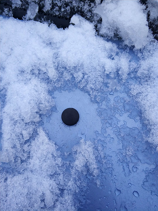 Hart gefrorene Schneeoberfläche, die mich locker trug und meistens auch mein Auto. Aber nicht beim wenden und lenken. Der Schnee war so tief, dass ich gleich mit dem Motorraum unten aufsetzte. Schaufeln half da nicht viel. Inzwischen hatte sich die Subaru Familie (Mann schaufelte, Mutter und kleine Tochter schauten zu) unter lauten Freudengejohle freigeschaufelt und geruckelt. Die hatten auch versucht, den Parkplatz zu erreichen. Das scheint aber nur für den Sommer vorgesehen zu sein. Die haben dann bei mir gehalten und nach ein paar Minuten war ich auch wieder frei. Das erste Mal seit Jahren festgefahren... peinlich ;)