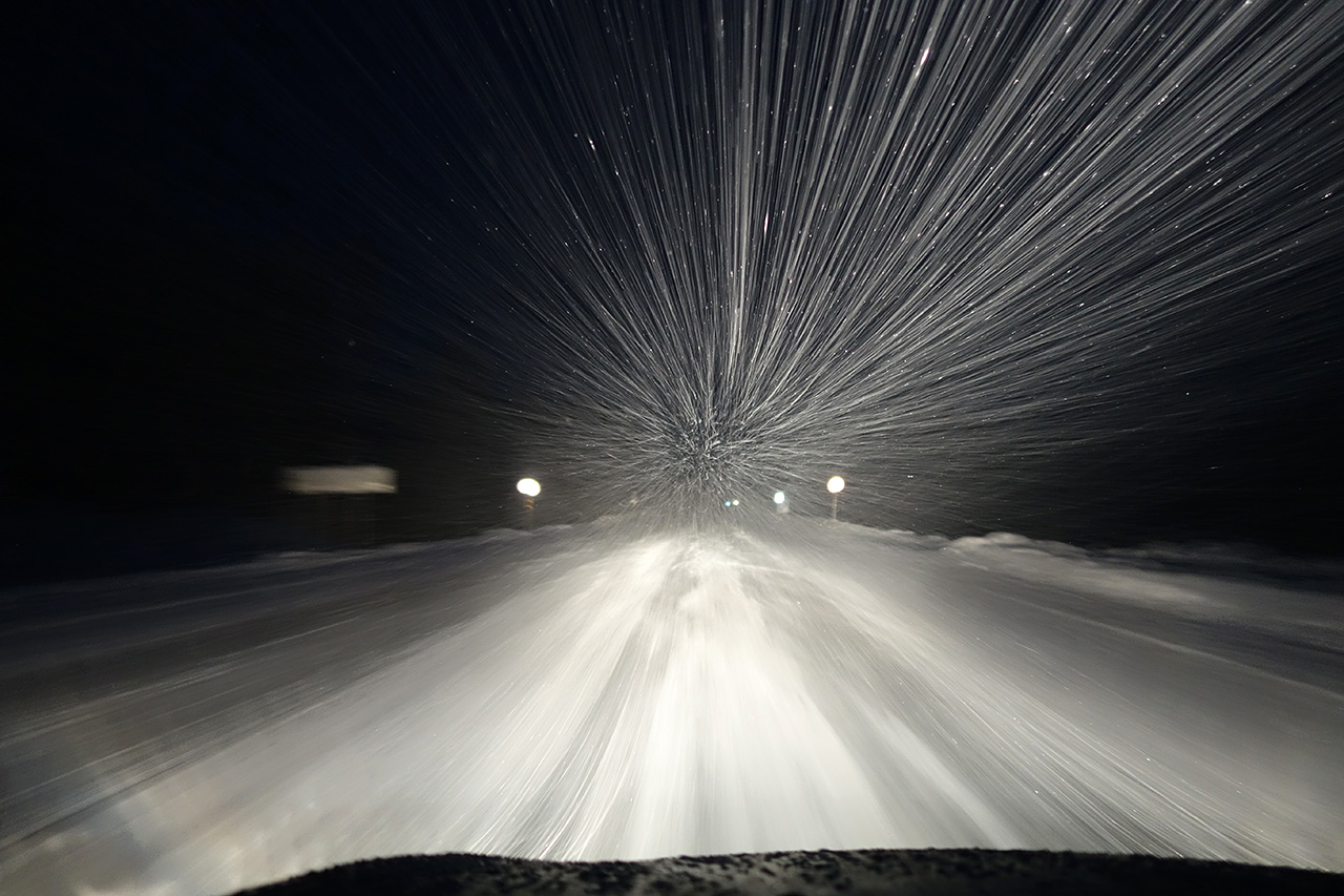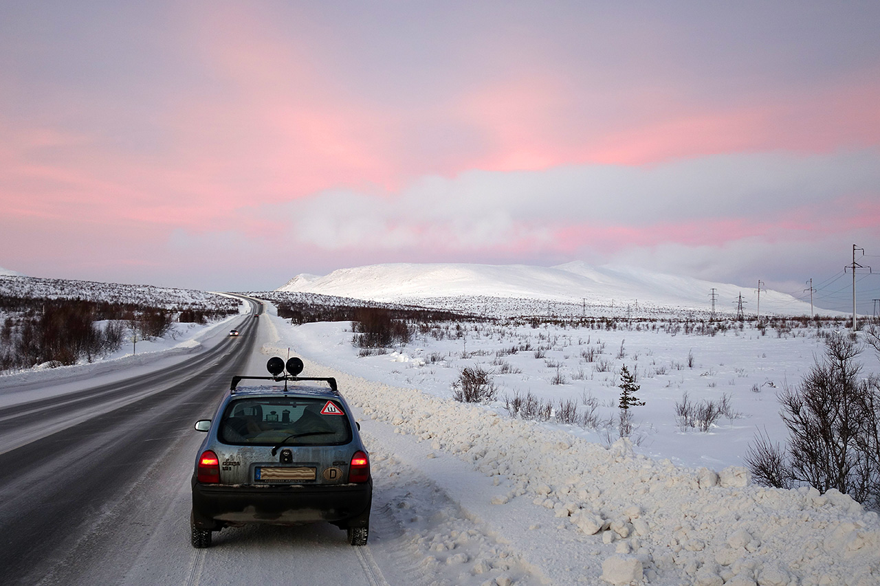 Die Straße dahin führt 130km durch menschenleeres Gebiet, aus Tundra wird langsam Polarwüste. Ca. 1/4 der Strecke ist vom Mobilfunk abgedeckt. Etwas spannend ist das schon, durch Schnee und Eis allein da hin zu fahren. Das war aber nur die Aufregung vorher, weil man nix von den Umständen weiß. Im Nachhinein war alles einigermaßen entspannt. Und es war unglaublich schön. Stundenlang durch unendliches Weiß zu gleiten. Tempomat 60km/h war (mein) Maximum und selbst damit ging es ab und zu im drift um die Kurven.