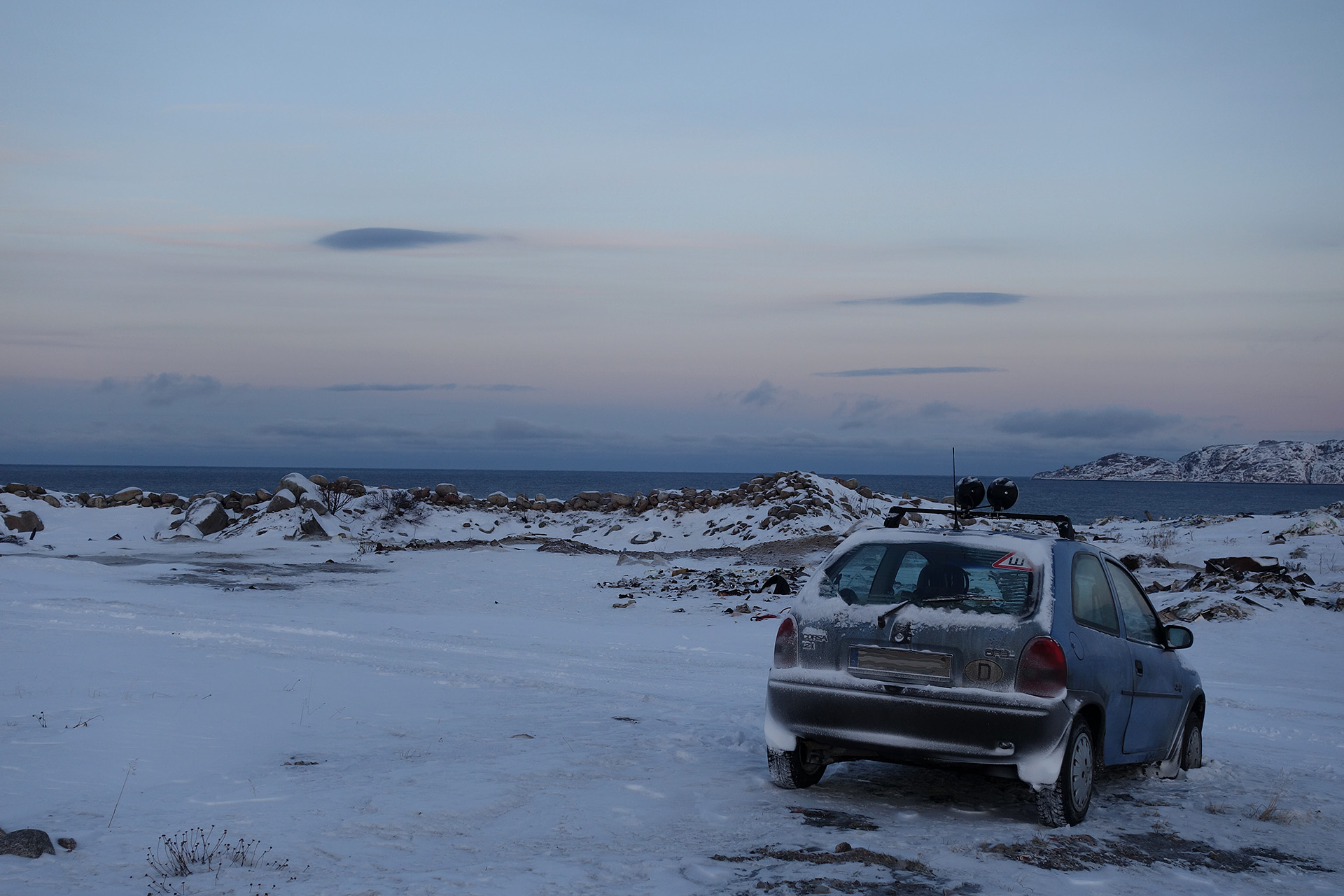 Direkt hinter dem Ufer an der Barentssee war ein Parkplatz eingezeichnet. Ca. 2km hinter dem Ort. Der Weg ging so, war eben ein hügeliger Feldweg mit ordentlich Verwehungen. 500m vor dem Parkplatz stand ich in einer Müllhalde, aber mit einem Weg hindurch. Der Schnee wurde tiefer, nichts mehr geräumt. 200m weiter vorn sah ich einen feststeckenden 4WD Subaru, deren Besitzer am eifrig schaufeln. Gut, das muss ich nicht haben, dachte ich und drehte um. Und zack, steckte ich auch fest :D