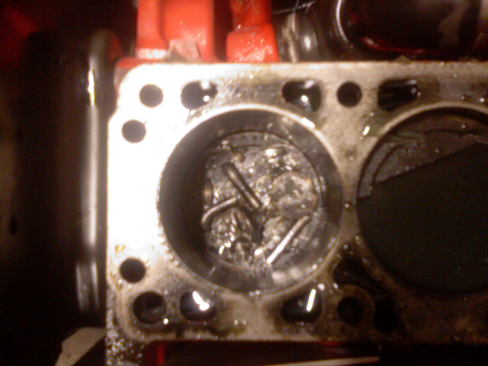 Aber was sich mir da aufgetan hat, hätte ich niemals erwartet! Kapitaler Motorschaden - 3 Ventile von Zylinder 1 abgerissen, völlig deformiert lagen die Reste davon im Zylinder, ein Ventil hatte sich soweit in den Kolben geschlagen dass dieser regelrecht durchbohrt wurde. Ein anderes Ventil hat es bis in den Ansaugtrakt des Zylinderkopfes gedrückt, so weit bis sogar der Zylinderkopf dort um den Kanal gerissen ist. Alles absolut fatal.