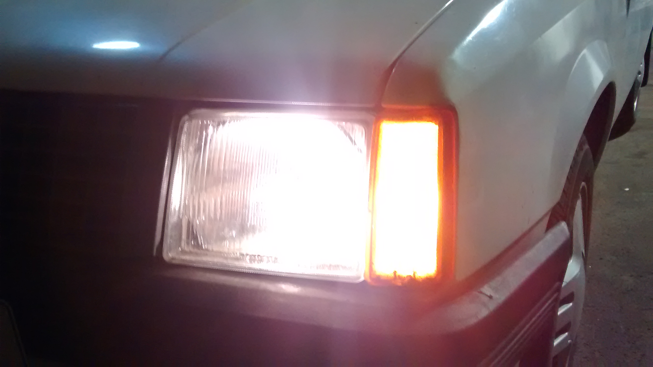 Aus meinem Sammelsurium an Scheinwerfern fix zwei Standlicht-Fassungen genommen und in die Blinker löcher gebohrt. Kabel Anschließen und fertig ist das US Standlicht. Geht mit dem Standlicht an und ist mit einer 5W Lampe noch dunkel genug, damit man das Blinken sieht.